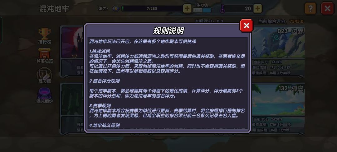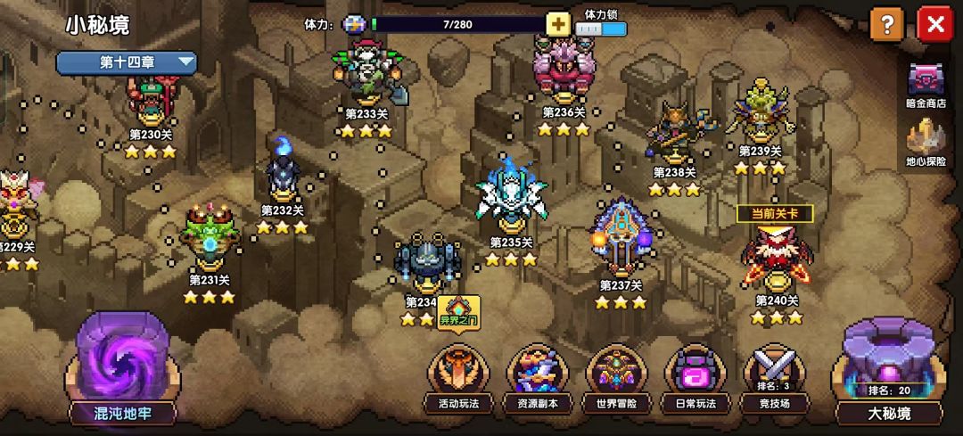 我先概括一下游戏副本组成:小秘境(共240层,不会刷新),用来前期开荒。大秘境(七十层普通大秘境,120层三种属性的元素秘境,以及27层魔王元素秘境),元素秘境有群怪和boss挑战两种模式,一个月替换一次。资源副本,推荐多刷宝石资源,其他的每天刷一下额外掉落去拿电池,每周拿满25个。世界冒险(包含重返勇者城和星界远征),重返勇者城算是一次性小游戏玩法,可以拿一些技能突破升级材料和一个皮肤。星界远征可以掉落星界装备和不少的其他资源,长期都可以去打。日常玩法(包含技巧试炼、钥匙挑战、深渊狩猎、魂卡试炼)是每天都要刷满的,深渊狩猎中午打通关后点重置,可以挑战下一关,这样重复一直打到打不过为止。竞技场(勇者的排位模式?)每周一、周五凌晨结算,也可以获得武器币和部分材料。以及活动玩法(包含世界boss和异界之门),世界boss主要给钻石和自选魔女碎片(24年12月19日更新后也会奖励传说勇者系列魂卡自选包),每周六、周日两天开启,每天晚上凌晨结算奖励;另一个目前是异界之门,可以兑换许多材料,每周五凌晨刷新次数,一周可以获得三次奖励,但是每天可以刷60次右侧的三个隐藏宝箱,给升级装备的白尘和黄尘,噩梦三平均一次700白尘35黄尘(后期缺红尘,不用专门刷),异界之门有传送点,可以看一下异界之门•急冻领域•图解•视频演示。混沌地牢:通关小秘境120层后解锁,主要掉落混沌暗金装备,是目前版本强力的防具。混沌地牢共30层,1-10层是刷装备的,10层奖励封顶。10层以上是刷评分的,评分规则是:在每周四早上10点轮换狂暴和强韧两种模式,每种模式单独算评分,评分取所有地图中三张评分最高的算。混沌地牢每张图都有隐藏房间,给元素之息和混沌之尘,可以看一下【混沌地牢】玩法简介&地图推荐路线。