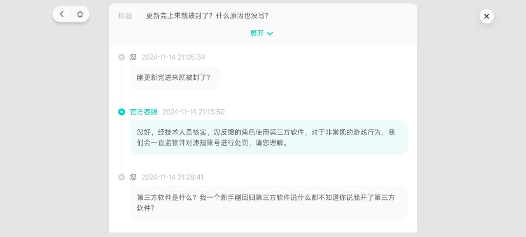 人机客服一直说我使用第三方软件又拿不出证据也说不出我使用的什么软件,我手机上只有一个连点器,除了这个以外无任何其它第三方软件,并且连点器在我游玩期间也就是本周从未打开没有使用记录