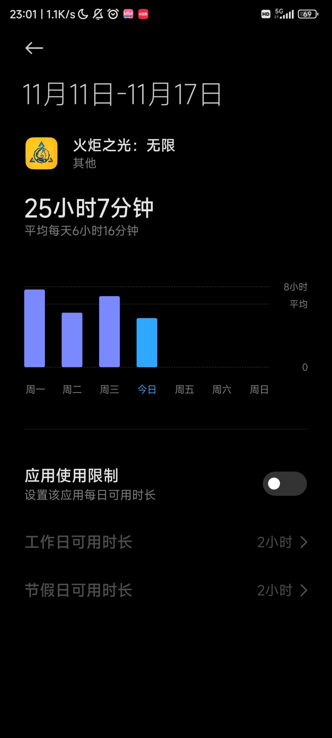 以上视频是我11月13号当天使用过的所有应用,在下午1点打开过的应用只有,qq,哔哩哔哩,时钟,火炬之光,这四款应用。