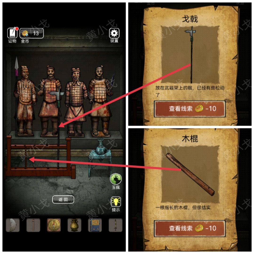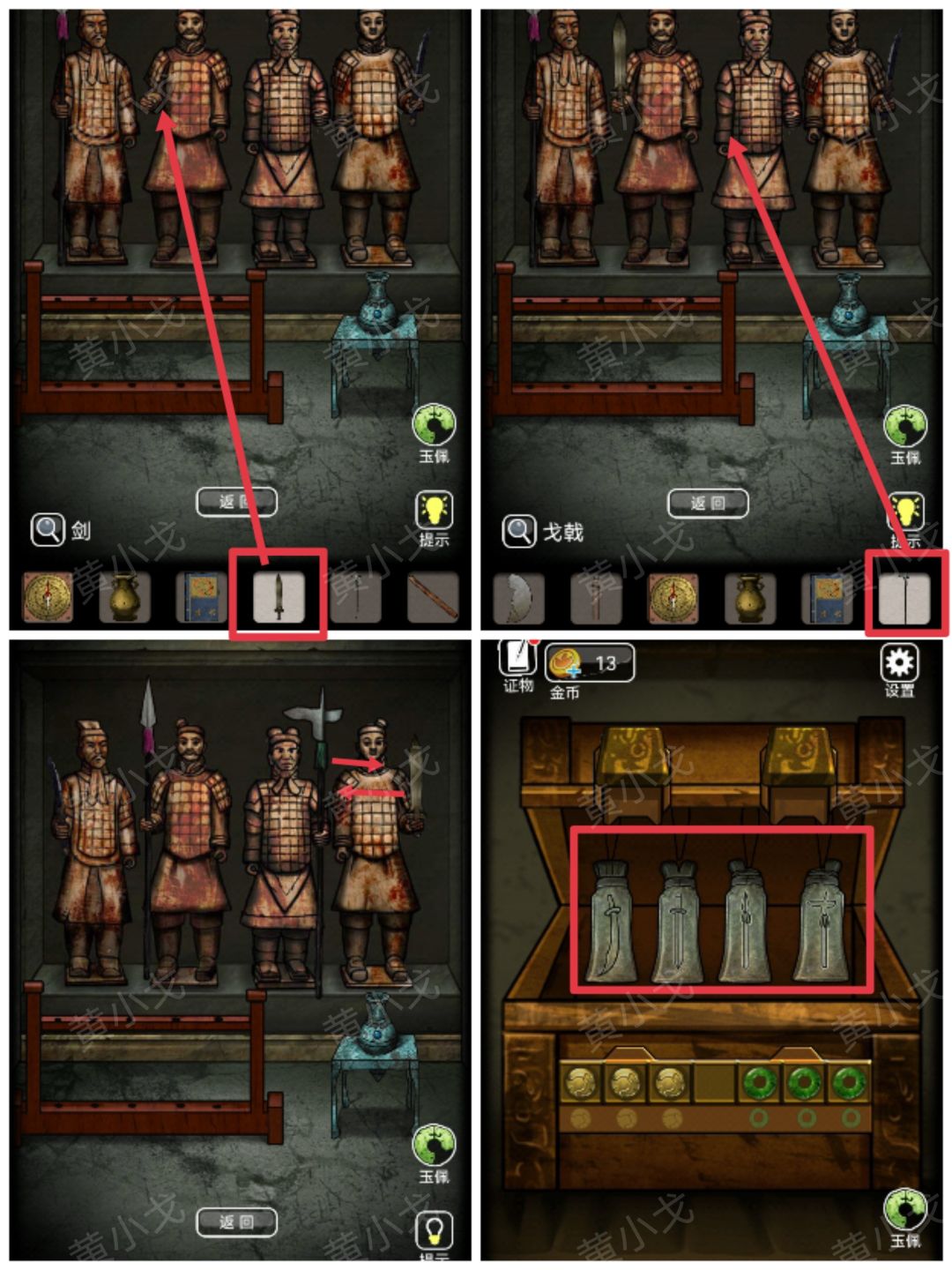 11.把【戈戟】和【剑】放到兵马俑手上;根据身份腰牌上的线索和兵马俑的头饰,调整兵器的位置