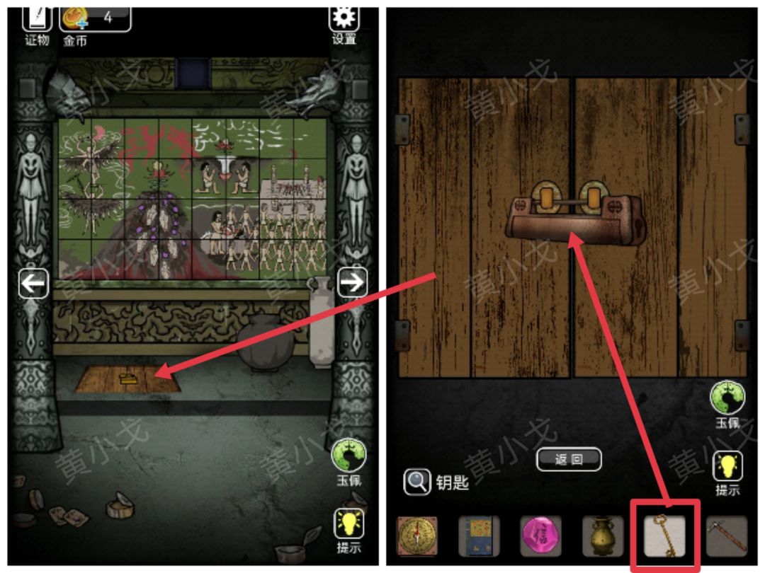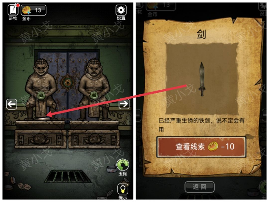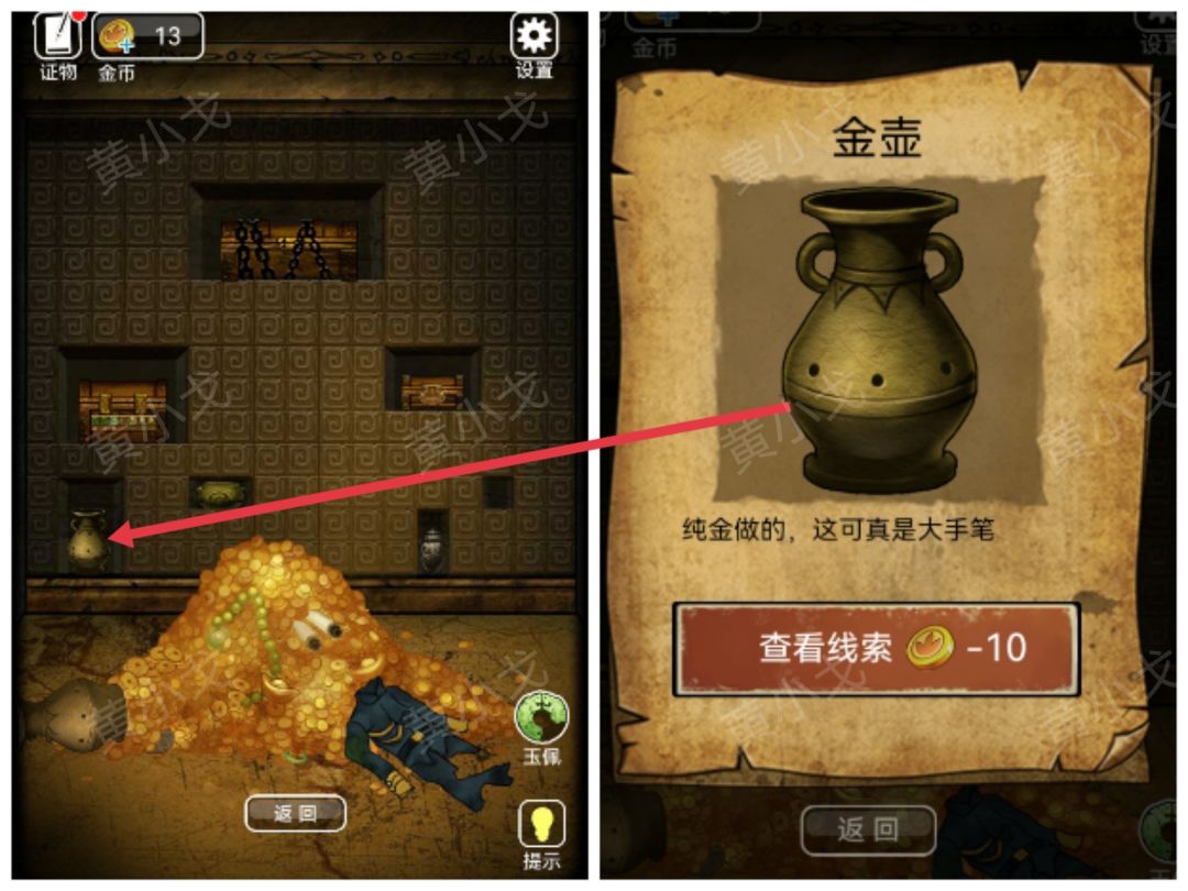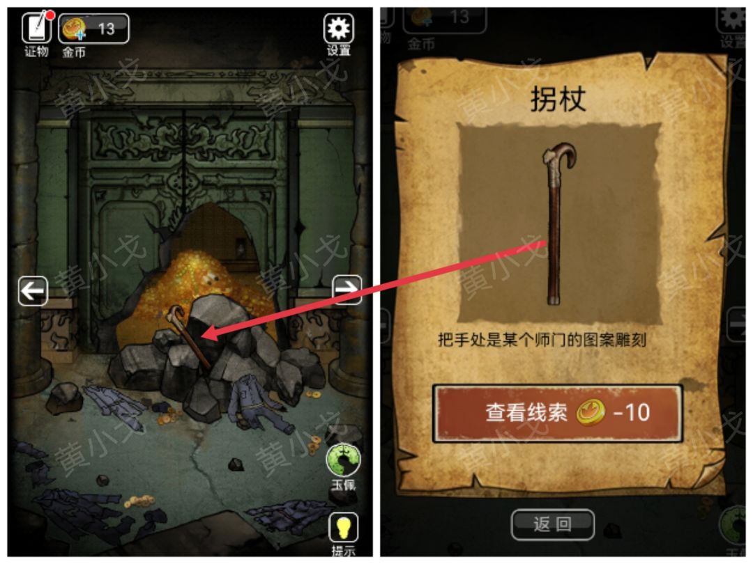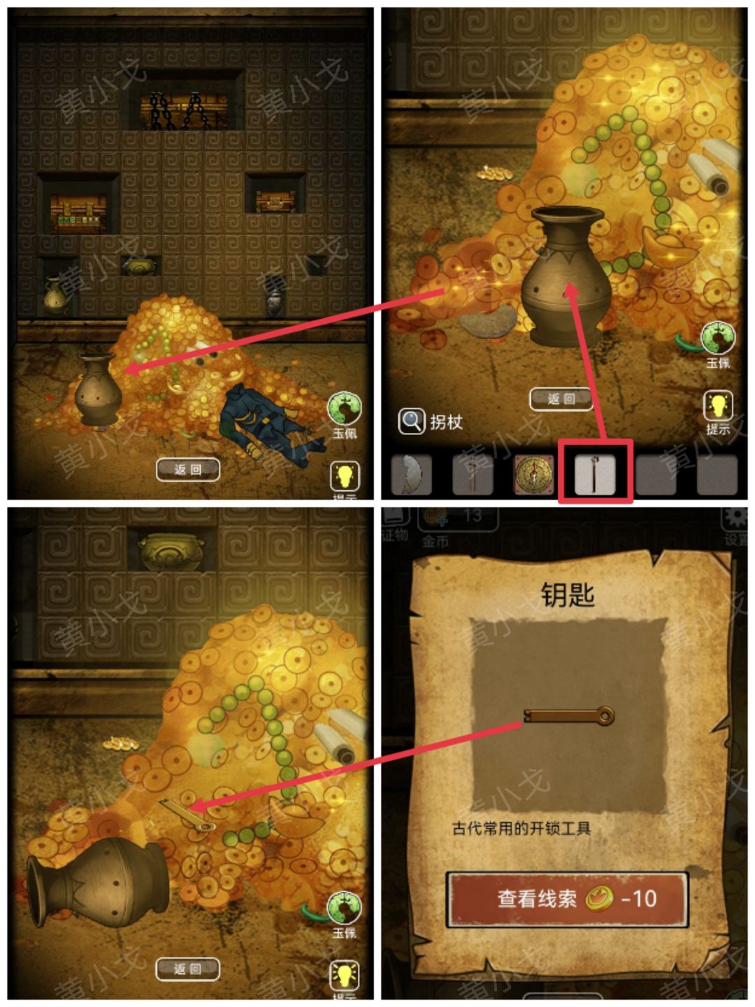 3.点击财宝堆,用【拐杖】拨开金壶和表面的金币;获得【钥匙】