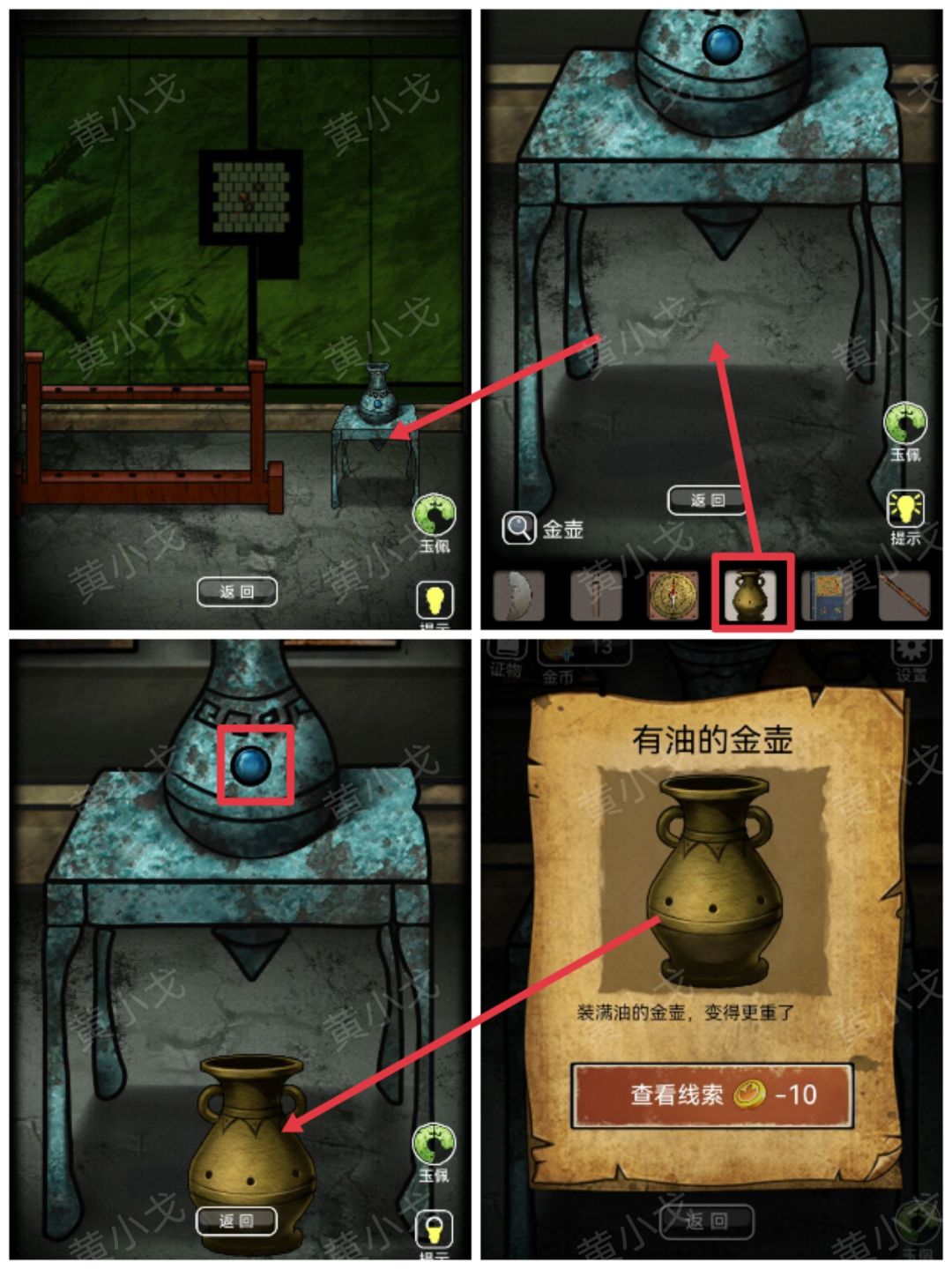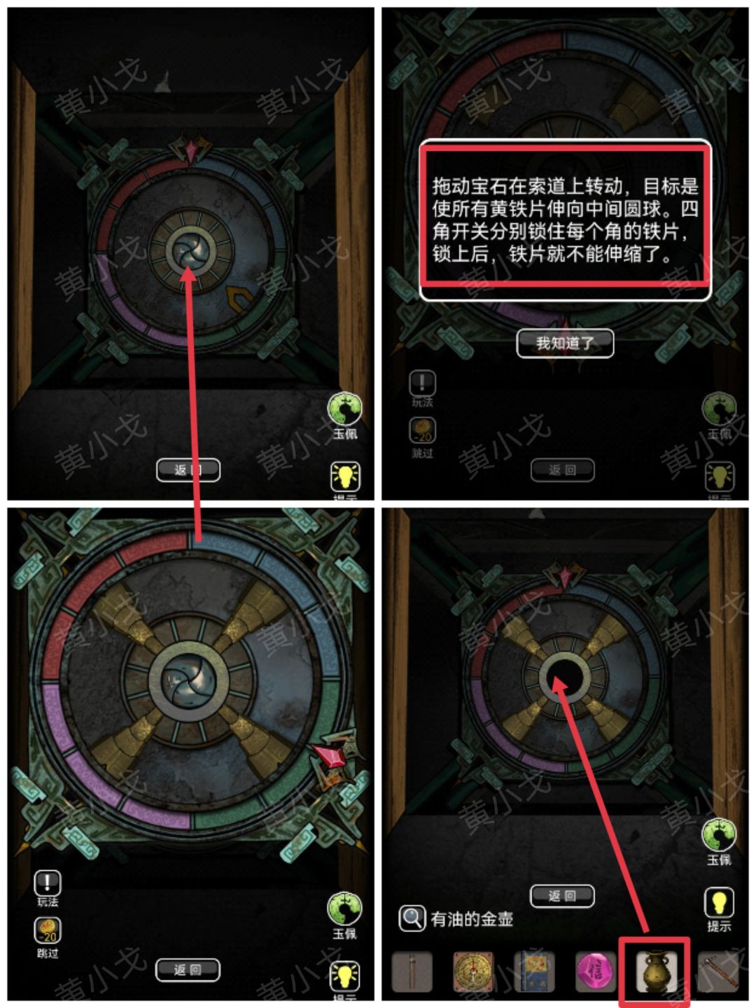19.点击里面的装置,查看玩法说明,完成拖动宝石小游戏;打开装置,倒入【有油的金壶】