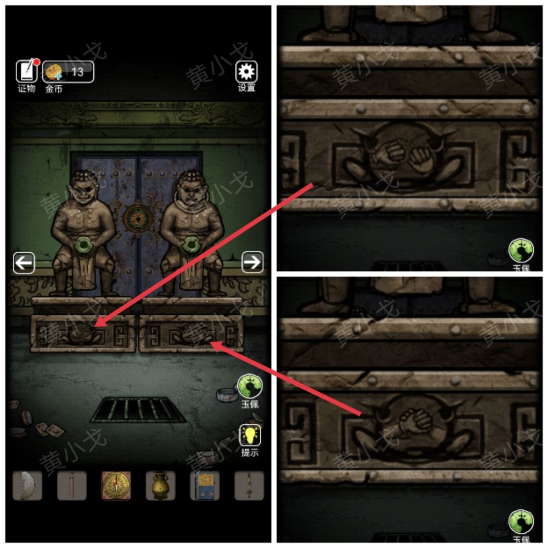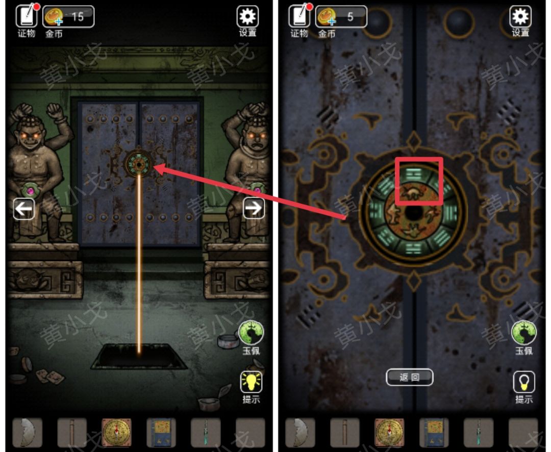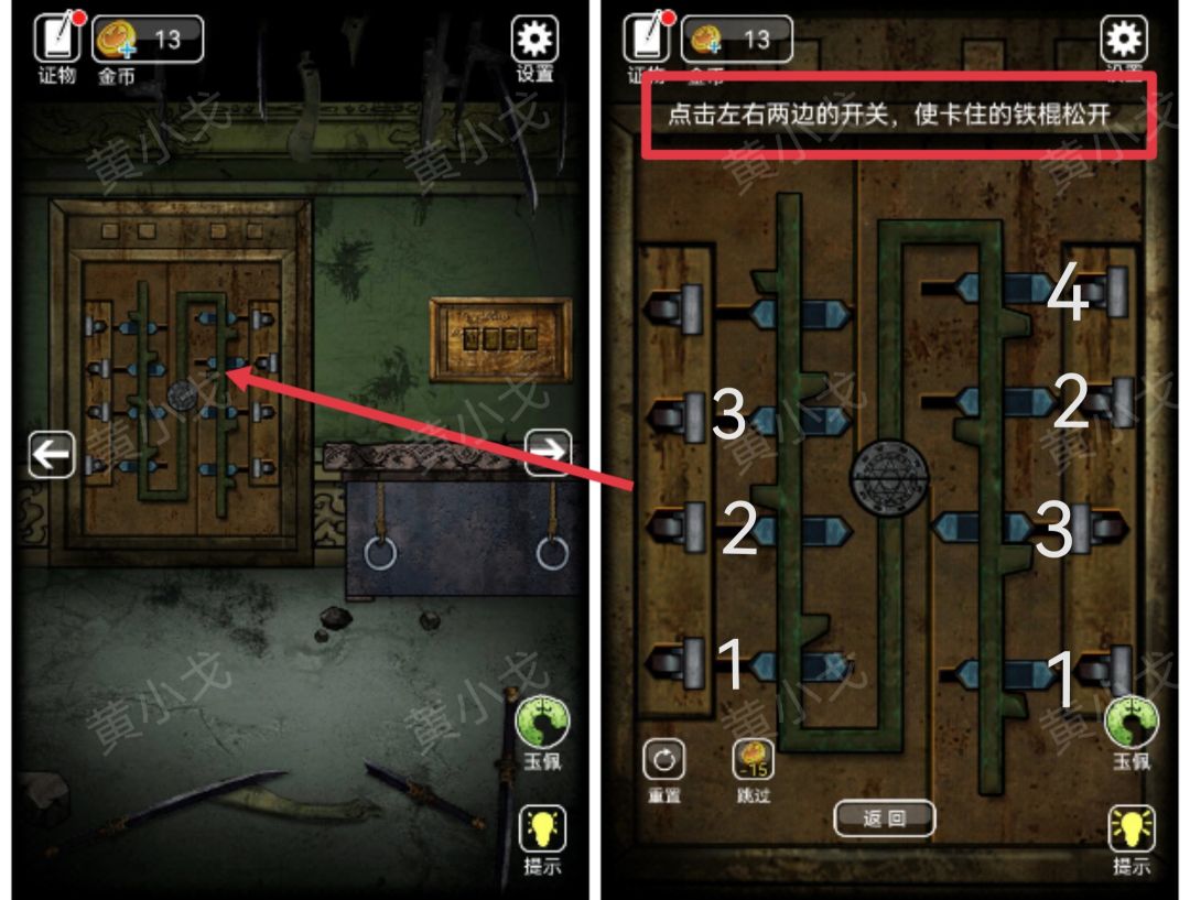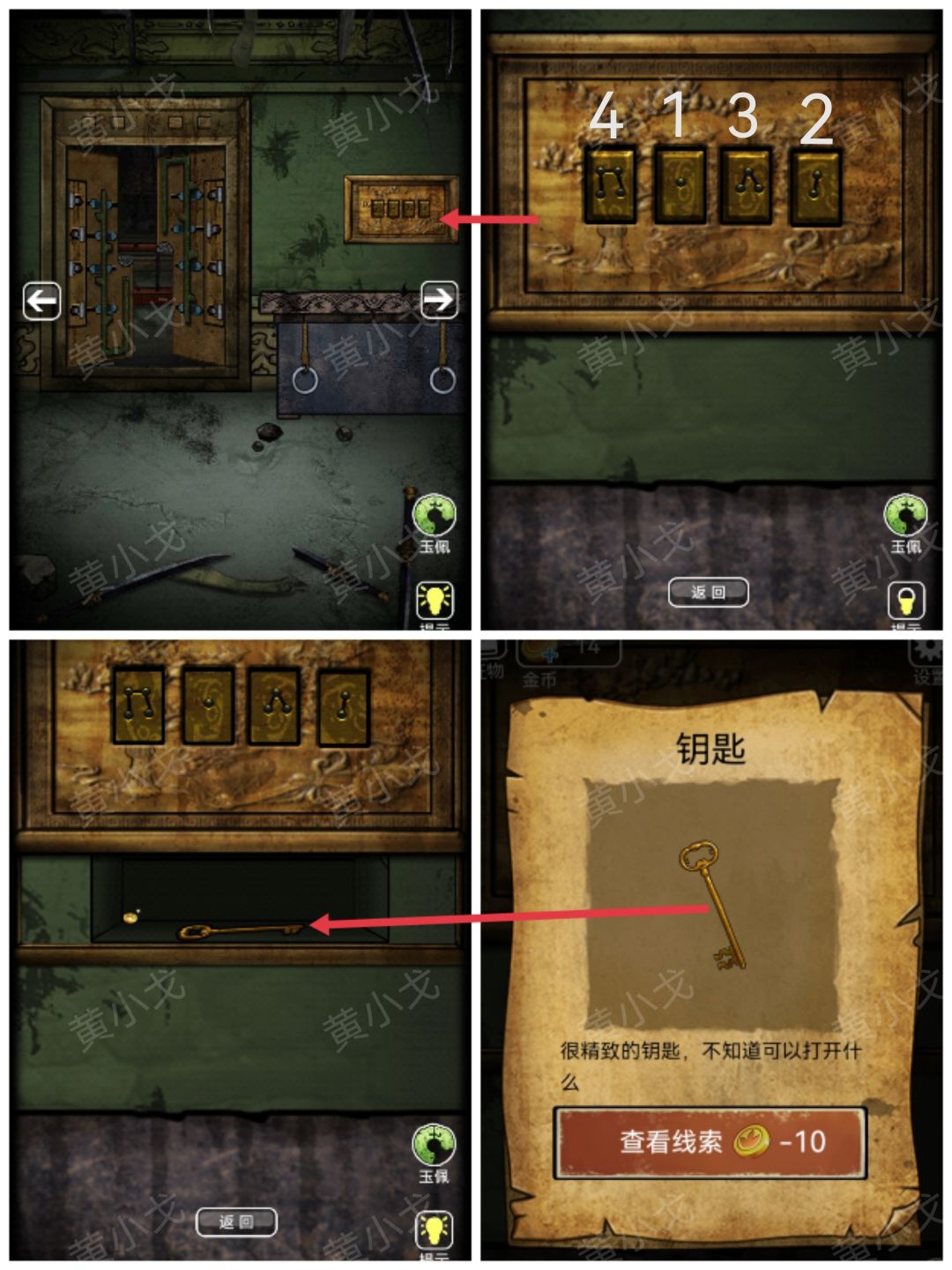 15.点击墙上的木雕机关,根据按钮上的圆点数,按顺序按下按钮;打开暗格,获得【钥匙】