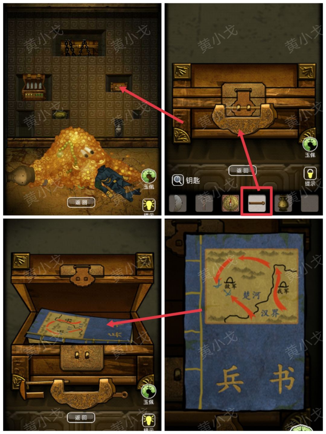 6.点击右侧箱子,用【钥匙】打开上面的锁;打开箱子,获得【兵书】