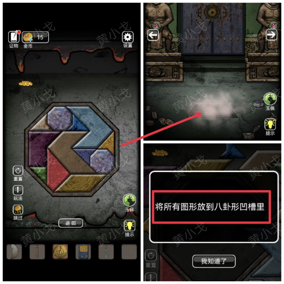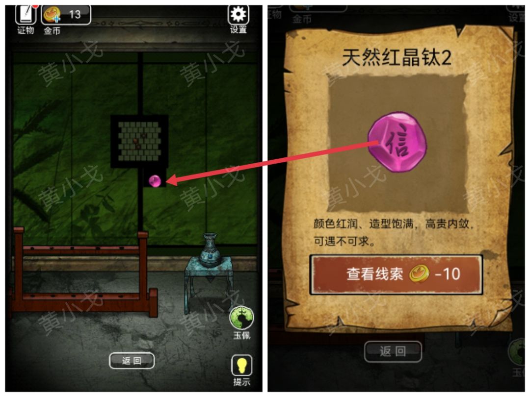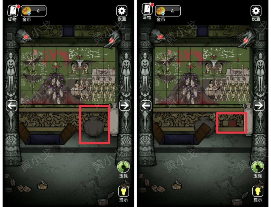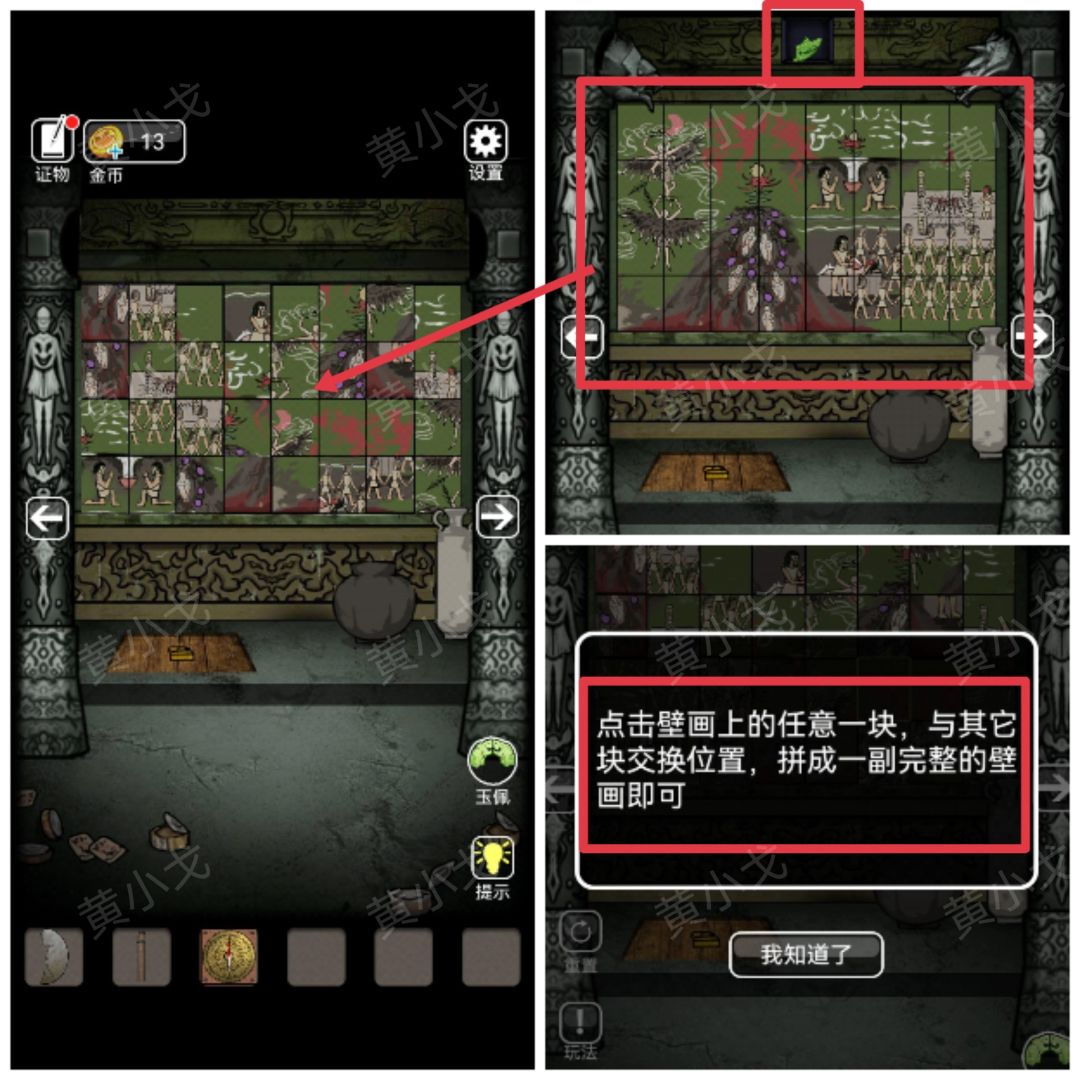 1.点击壁画,查看玩法说明,完成拼图;打开暗格,获得玉佩碎片