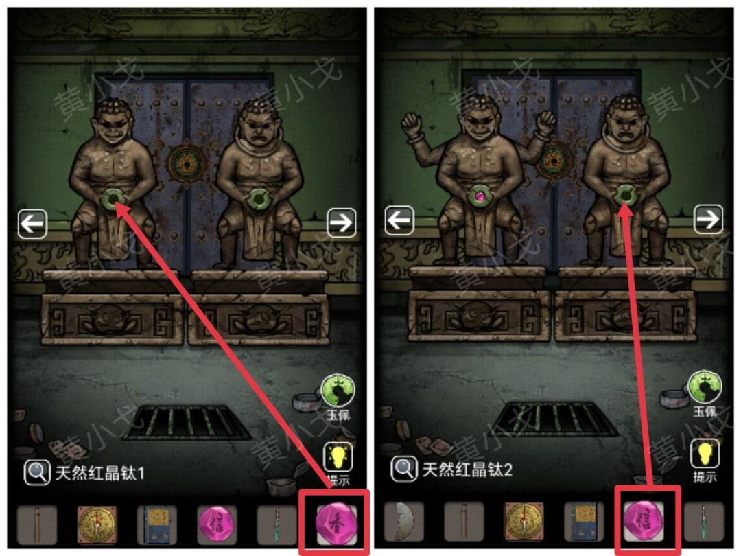 26.把【天然红晶钛1】和【天然红晶钛2】放入两个石像手中的圆环
