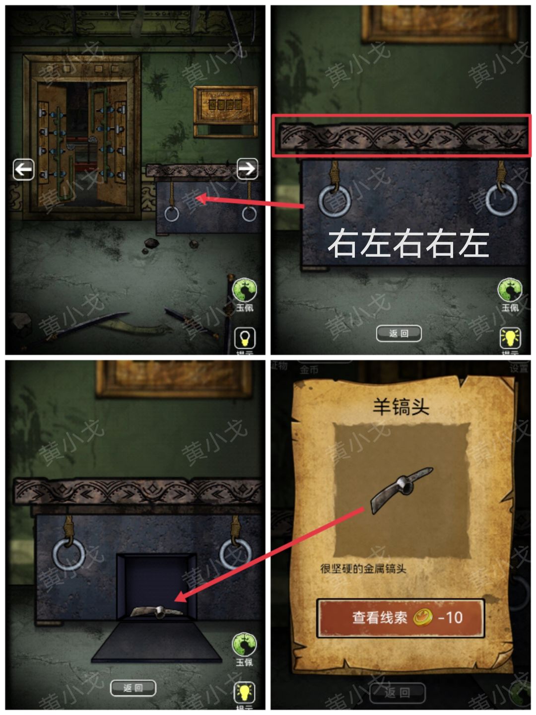 16.点击制作台上的圆环,根据制作台边缘上的箭头朝向,按顺序拉动圆环;打开暗格,获得【羊镐头】