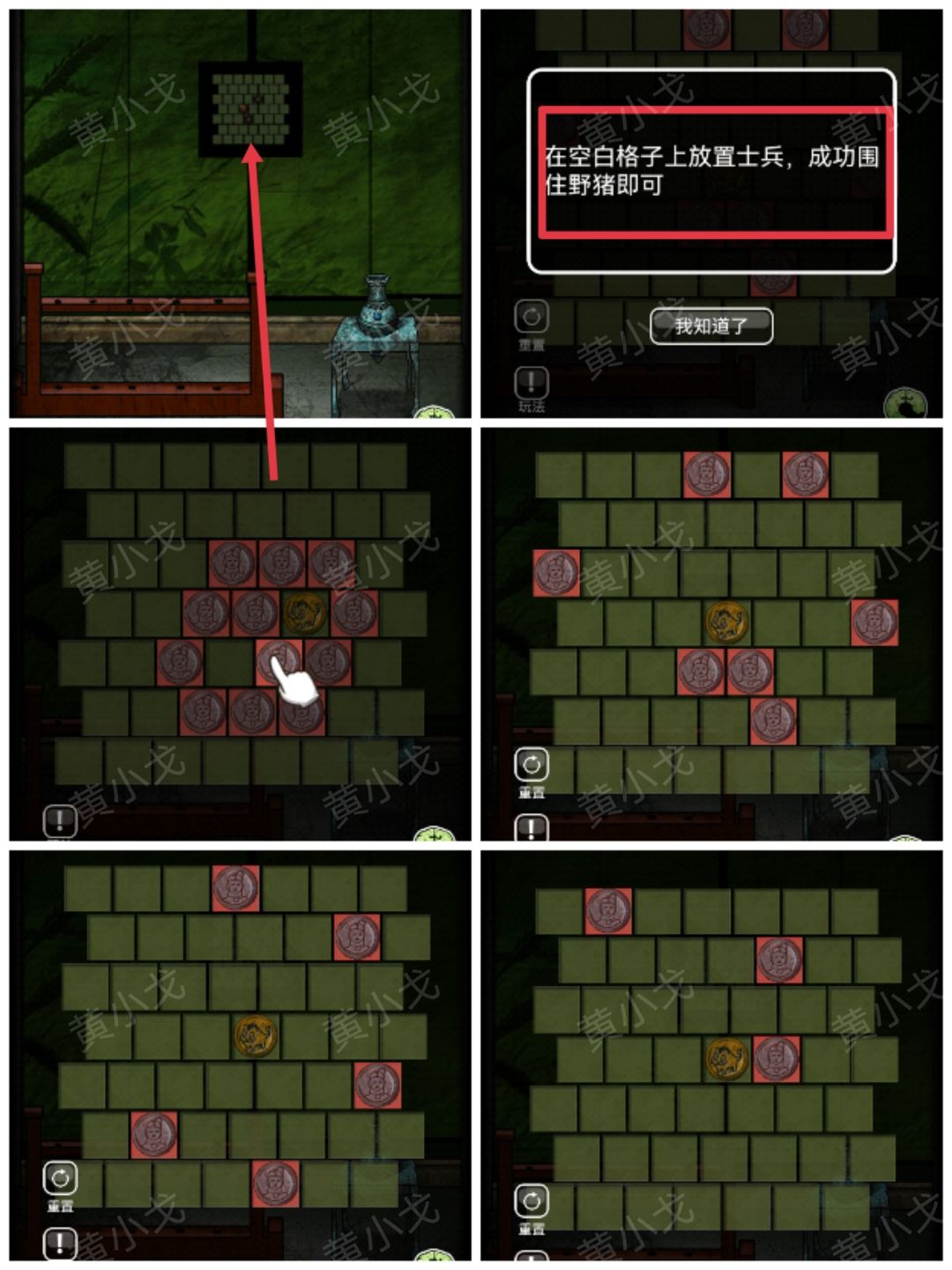 12.点击屏风上的机关,查看玩法说明,完成围野猪小游戏