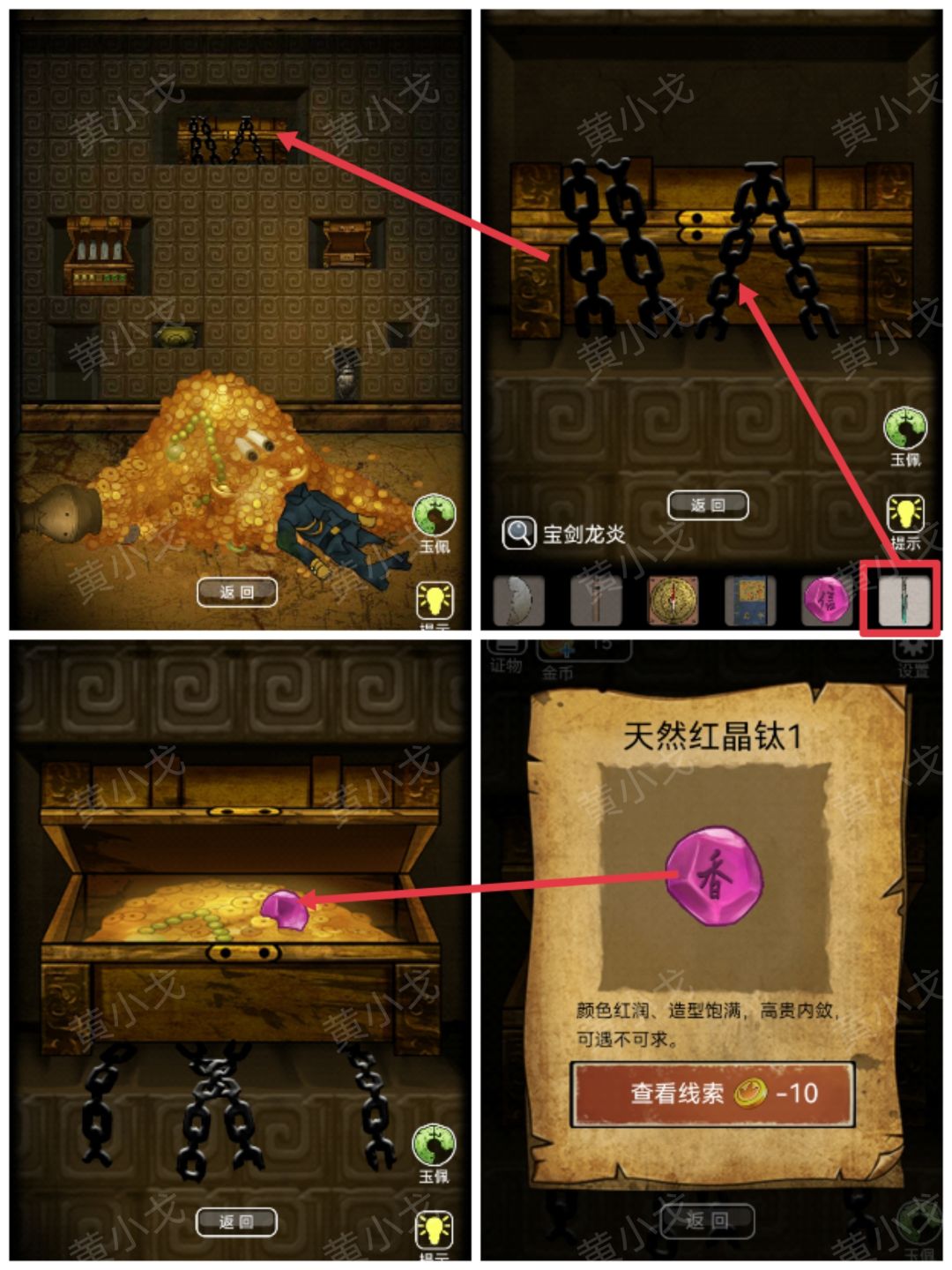 25.点击最上边的箱子,用【宝剑龙炎】劈开铁链;打开箱子,获得【天然红晶钛1】