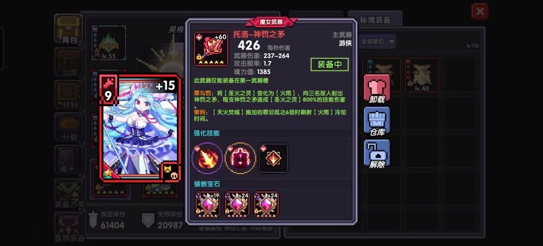 武器的组成有最上端灰色部分的固定属性:仅和武器等级有关,不可洗练。副属性:三个随机词条,可以洗练提升,需要注意不同的武器可以洗练出的副属性也不同(冲浪板无法洗出暴击值,在洗练前请务必查看可洗练的属性)。星级效果:靠血源矿和吞噬其他武器强化星级,最高五星,不同等级解锁对应能力提升,一般是前三级加属性,后两级强化技能。强化技能:魔女武器升到四星和五星时可以强化对应的技能(紫色技能和职业相关,橙色技能全职业通用),符文能量达到800时也会大大强化魔女技能(见图3)。镶嵌宝石:一件装备随等级提升增加宝石槽(30、40、60级),最多可以镶嵌三颗宝石。限定武器可以镶嵌所有类型宝石,但是需要注意某种魔女宝石的特有词条:强化对应魔女技能(见图4),而该词条仅在携带了对应魔女技能时才有用,且技能等级上限为80级,超出部分无效(不过很难升到就是了)。另外,魔女武器只有镶嵌对应的魔神石时,其稀有属性才可生效(见图5)。
