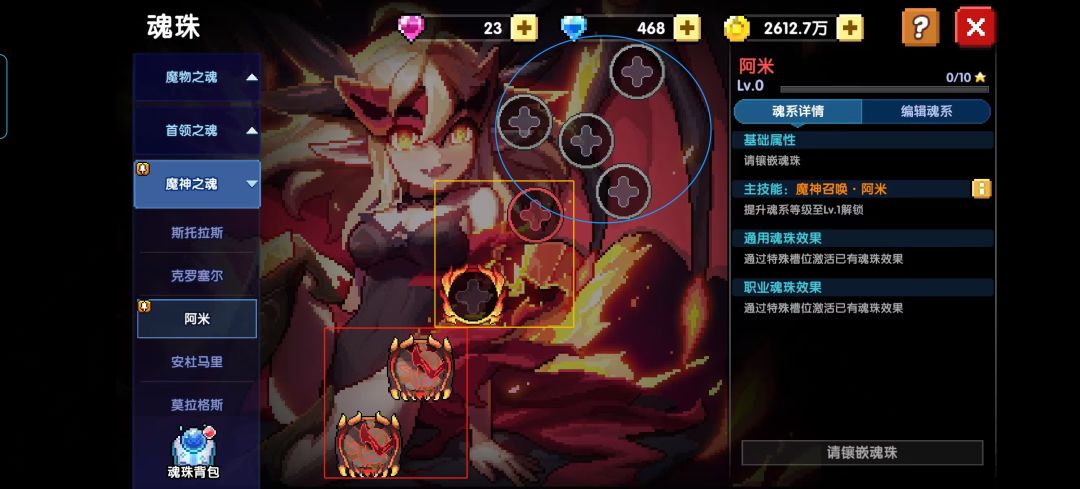 魂珠可以按照有无魔女印记(见图6,左下角两个镶嵌槽里的图像)、花边(下方三个镶嵌槽的红色花边)、颜色(下方四个红色的镶嵌槽)分为四类:第一类是红色方框中魔女镶嵌槽,仅可镶嵌该魂系对应的魔女魂珠(有颜色,有花边,有图像);第二类是黄框中左边的特殊镶嵌槽(有颜色,有花边),只有该部位镶嵌了魂珠,该魂系才可生效;第三类是属性镶嵌槽(有颜色),仅可镶嵌该魂系同属性的魔女魂珠;第四类是普通镶嵌槽(右上角蓝圈里的四个),可以镶嵌所有的魂珠。