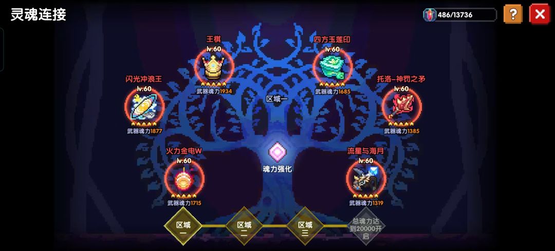 灵魂连接共五个区域,在通关小秘境90层、魂力值达到4000、魂力值达到12000、魂力值达到20000、魂力值达到28000时分别解锁一个区域,主要玩法就是把武器挂上去,根据武器属性获得魂力值。因为限定武器觉醒后有觉醒属性,因此限定武器比魔女武器给的魂力值高(限定武器最高近2000,魔女武器最高近1450)。达到一定魂力值后可以自己选择并升级魂力属性,并解锁魂力爆发的强化效果(魂力值达到2000、4000、12000时分别解锁一层),在最上方也可以增添和修改灵魂强化页,方便根据使用场景更换不同的魂力强化加成。