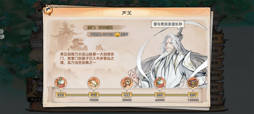 提高声望可解锁大量奖励(包含功法、丹药、古宝等)和宗门商店折扣。