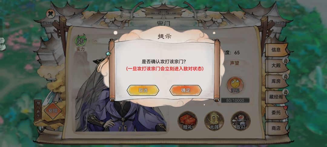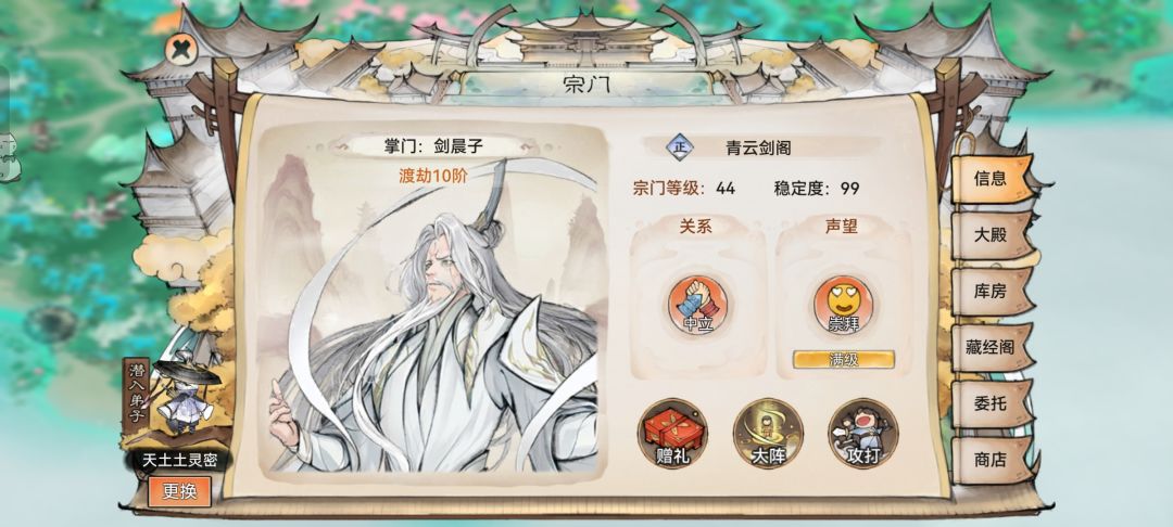 玩家可以通过派遣弟子潜入查看世界宗门库房、藏经阁、商店等信息。