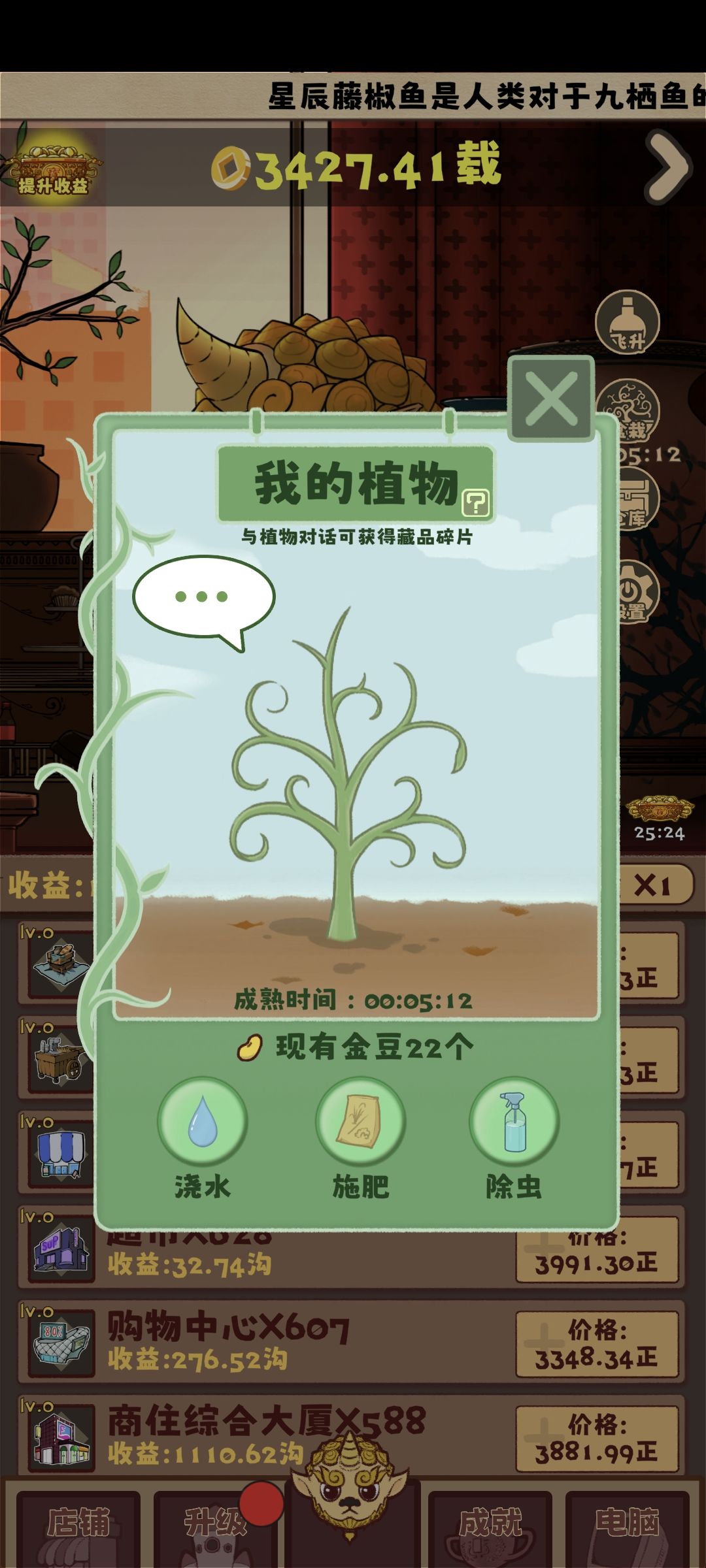 8️⃣这个挑战中最核心的东西:盆栽,这个模块可以使用改系统日期(在不关游戏,只切后台的情况下每次把系统时间往后拨一天,可以直接刷新3颗金豆和2次浇水(可以长出一颗金豆))获取大量的加成,并且跟植物对话每天可以获取四块植物化石碎片,这个可以升星(但是有失败的概率),也可以提供大量的加成,具体的建筑等级和化石星数可以在帖子附图里面看,化石星数不用强求,实在升不上去或者不想刷化石(刷化石的时间是刷金豆的很多倍)直接把建筑多升个十几级应该也是差不多的。