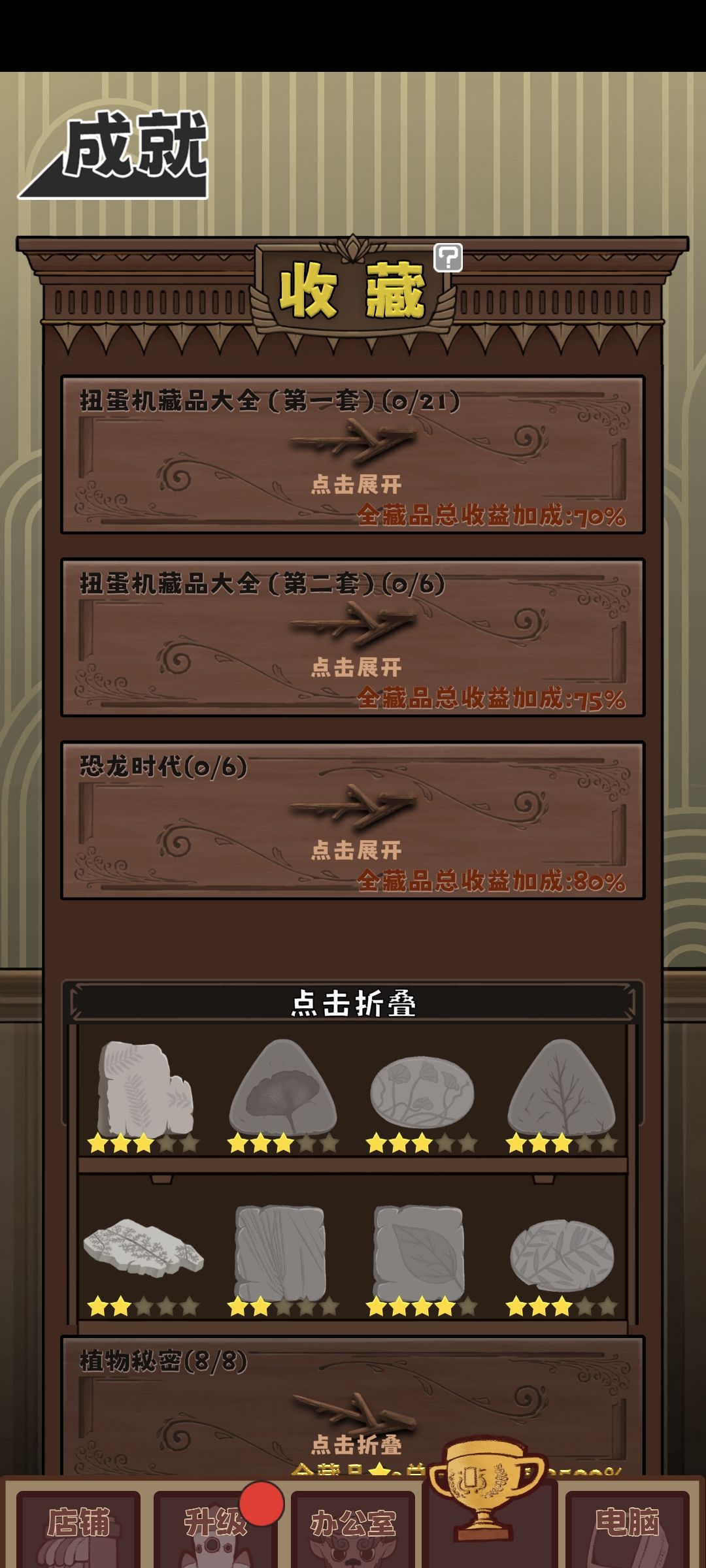 6️⃣因为建筑价格指数增长,我们要买的在倒数第二个,所以前面的建筑必须尽可能少买,所以确定第一个建筑买什么很重要,因为买第一个建筑只能通过点击(建议连点器)获取金钱。我在这里选择的是商住综合大厦(基础售价9900w),你没看错,要通过点击获取9900w,在(升级)界面可以升级每次点击获取的金币数量,这9900w在每秒十次点击频率(我设置的点击器频率,游戏中能否达到未知)下用时一小时左右。ps:游戏内所有的收益加成对点击不生效,买出商住综合大厦之前不用买任何加收益的buff。