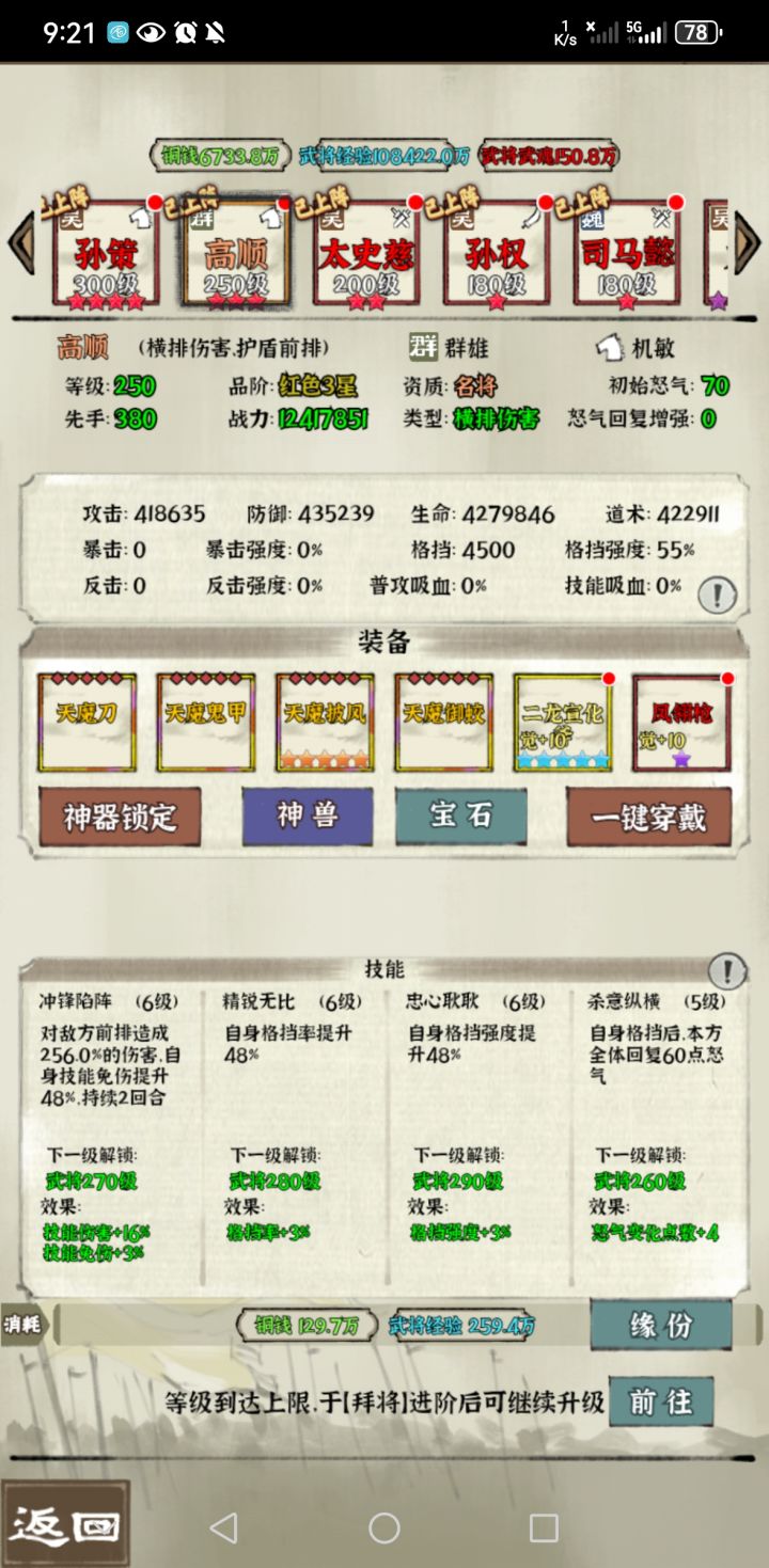 相比241-4,本关对于玩家的难度其实要低不少,核心在于高顺能否扛住对方三个npc的进攻。因此高顺面板生命越高越好,笔者的面板其实比较低,接下来简单说一下阵容配置。