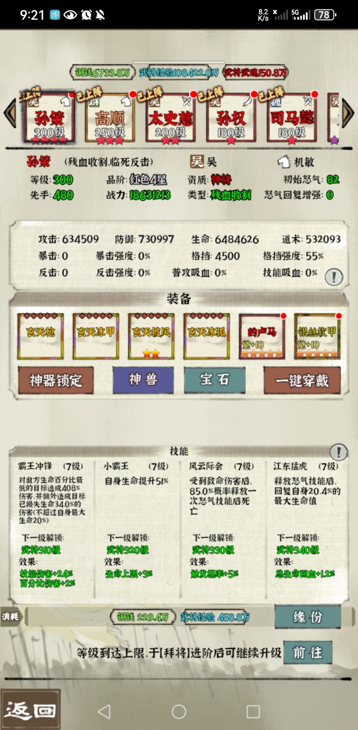 双冰夷(给高顺回血,笔者高顺太弱了,这种方案能够保住高顺的命,双冰夷+凤凰一回合回满),龙马(给孙策提伤),凤凰(给高顺抗伤),鸣蛇(主c孙策带)