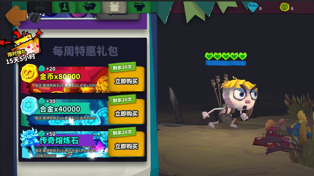 - 金币每周特惠礼包额外赠送:合金x2000,重铸石x2,重铸刷新石x1