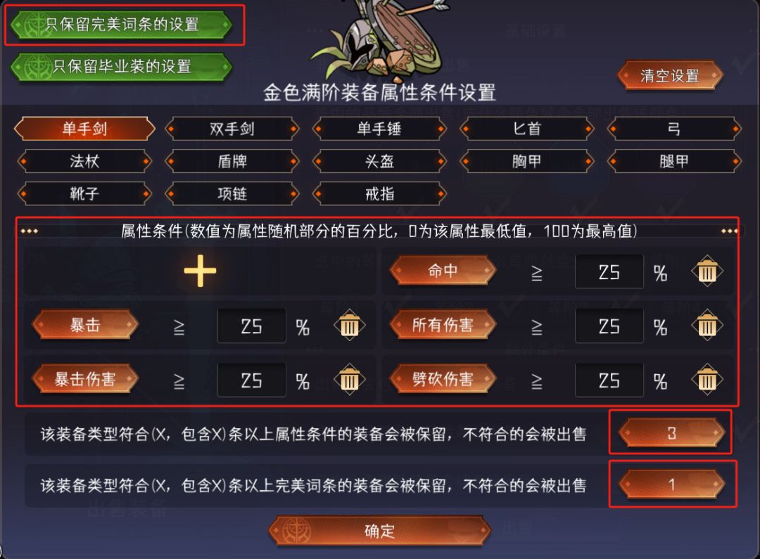 点击左上角“只保留完美词条的设置”后会变成下图的状态,此时只会保留至少有一条完美词条的装备,无论具体属性词条都是什么,只要有一条完美词条就会被保留,其他会出售。