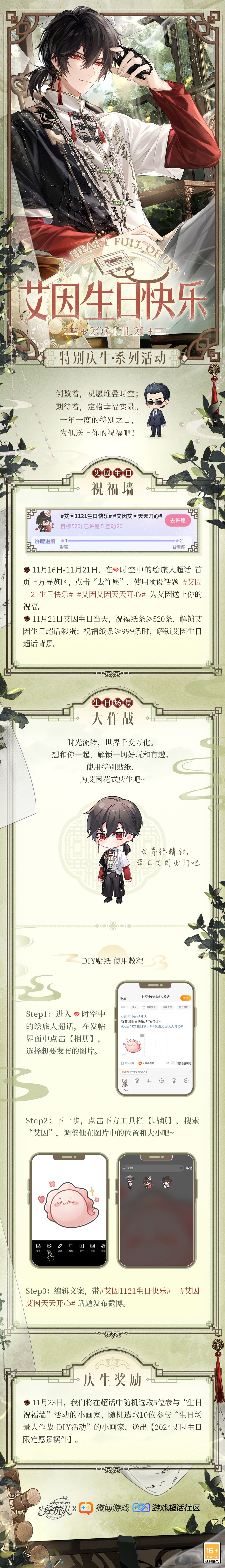11月23日,我们将在超话中随机选取5位参与“生日祝福墙”活动的小画家、10位参与“生日场景大作战”活动的小画家,送出【2024艾因生日限定愿景摆件】1份。