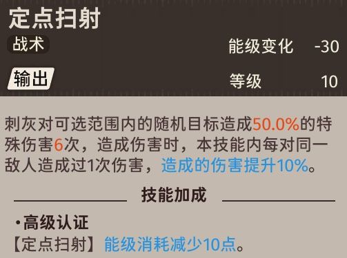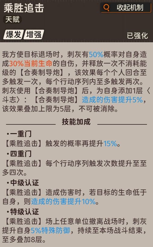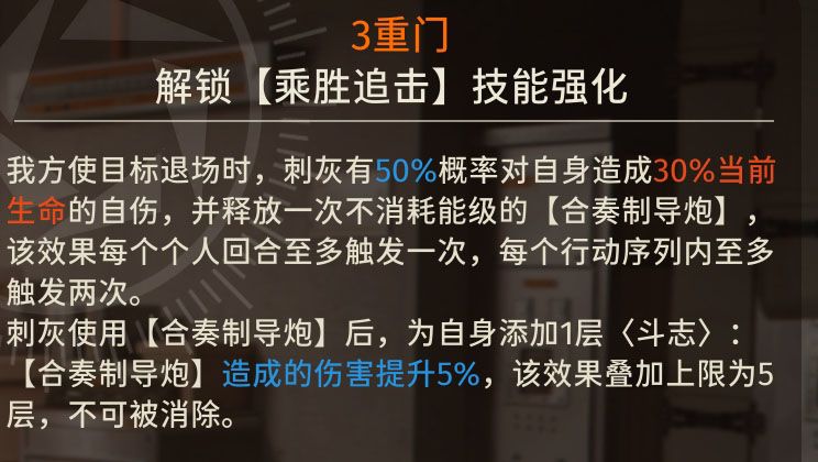 我方技能使敌方退场时,刺灰有50%的概率对自身自伤释放不消耗能级的超限技