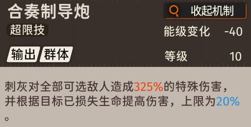 自伤是扣当前生命的30%,不是扣总血量的30%,只要刺灰不退场,即使只要少量血条,也能一直释放超限技打伤害每次释放超限技都可叠加超限技伤害,最高可到25%,结合超限技本身的特性,可选敌方可以打370%的群体伤害,再加上叠加的40%的特殊防御,在对战特殊伤害的敌人会有更高的抗性,不会轻易退场