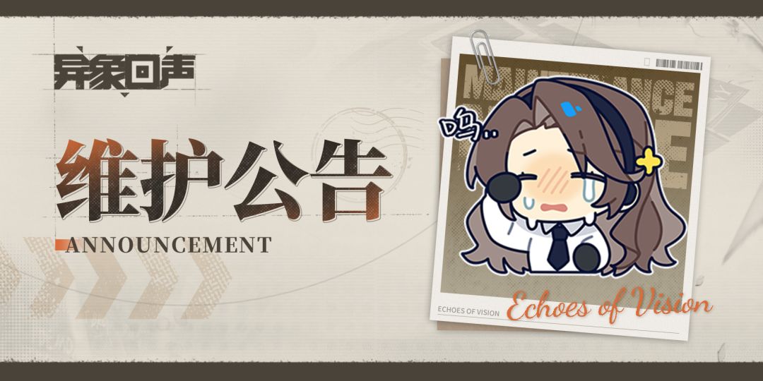 《异象回声》将于11月15日23:00左右进行一次闪断更新。更新过程中可能会出现短暂的离线,科长稍等片刻即可重新登录且继续进行游戏,请大家及时留意,避免造成损失。