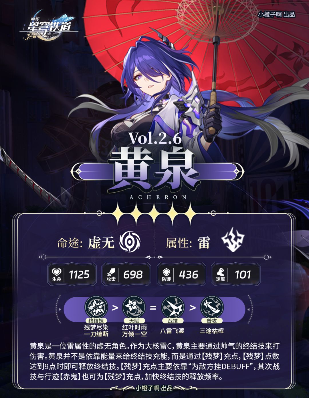 黄泉是一位雷属性的虚无角色。作为雷C大核,黄泉主要通过帅气的终结技来打伤害。黄泉并不是依靠能量来给终结技充能,而是通过【残梦】充点,【残梦】点数达到9点时即可释放终结技。【残梦】充点主要依靠“为敌方挂debuff”,其次战技与行迹【赤鬼】也可为【残梦】充点,加快终结技的释放频率。