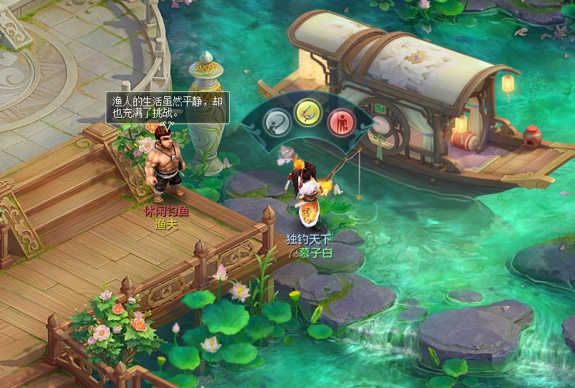 在《幻唐志》中钓鱼更为简单,玩家只需要找到渔夫购买鱼竿,便可以在繁华的长安城河流边、花果山的青山绿水中,甚至在自己的庭院池塘边随时随地开始钓鱼。