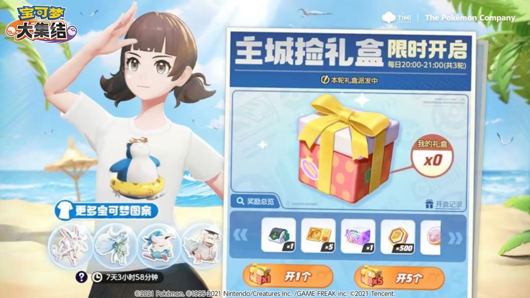 🔹每位训练家每天最多可拾取10个礼盒,打开礼盒可随机获得宝可梦特别T恤自选箱、牵绊糖果随机盒、亿奥斯币等丰富游戏道具奖励;