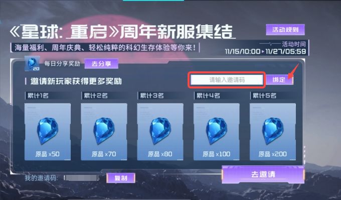 只需点击“去邀请”,复制你的专属邀请码并分享给好友!当你的好友登录减压新服并输入邀请码完成绑定后,首次成功绑定一位新人朋友,就能获得50原晶,同时,受邀好友也能获得100原晶奖励!奖励将通过邮件发放给你!
