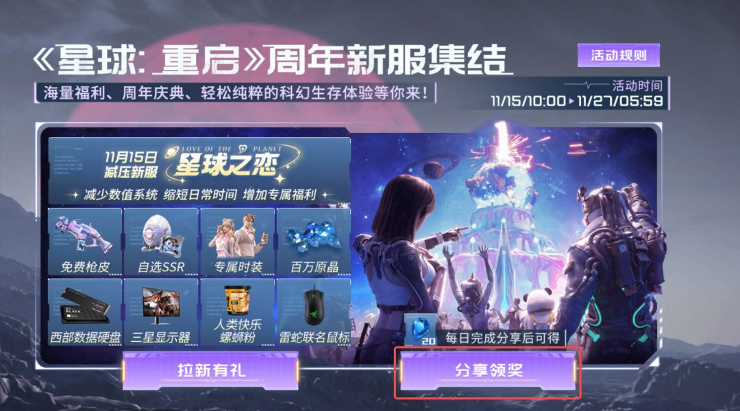 打开《星球:重启》减压新服集结活动界面,点击“分享领奖”,然后选择抖音、QQ或微博分享给好友!没错,就是这么简单!不需要太多条件,只需要动动小手就能领到这波福利!目前仅支持抖音、QQ和微博分享,且仅限移动端参与哦~各位幸存者们注意不要走错地方!