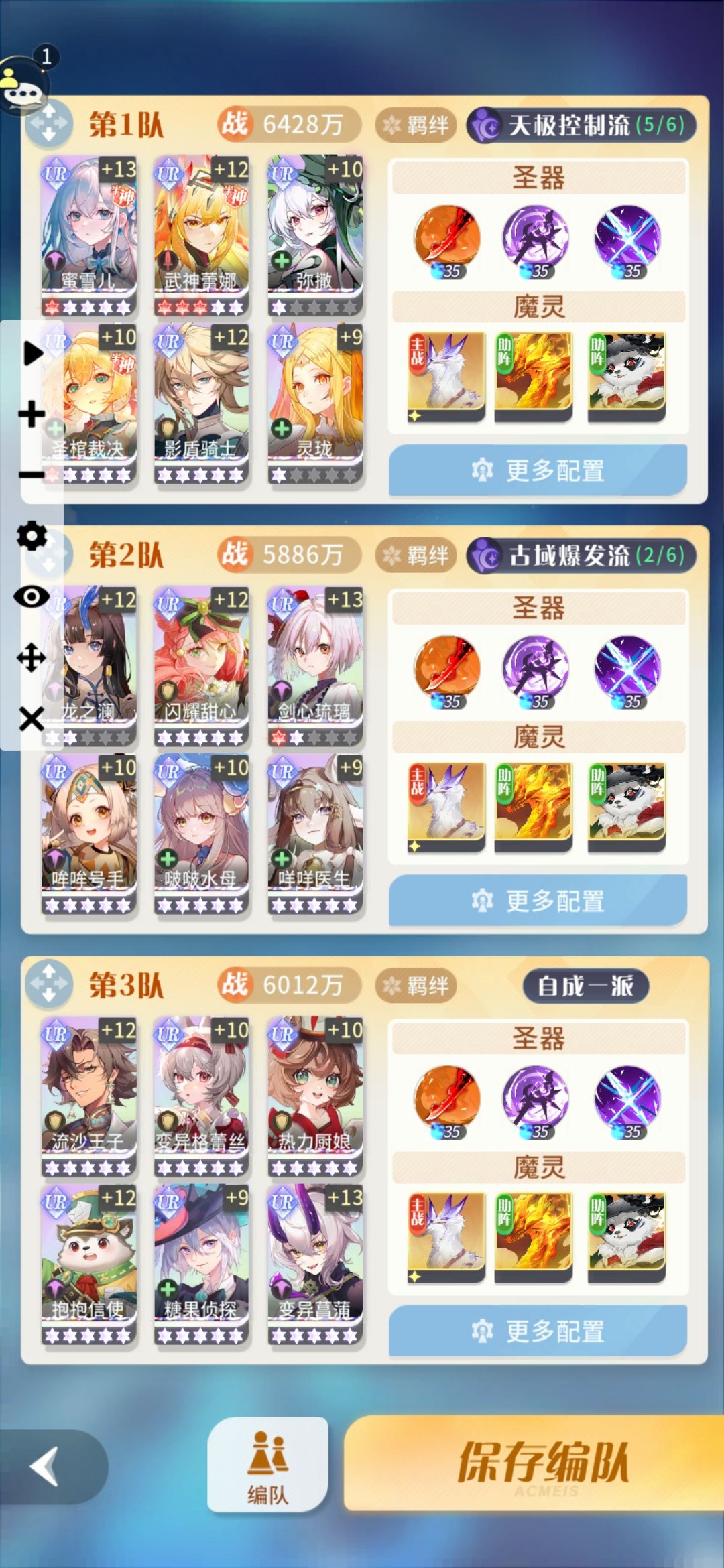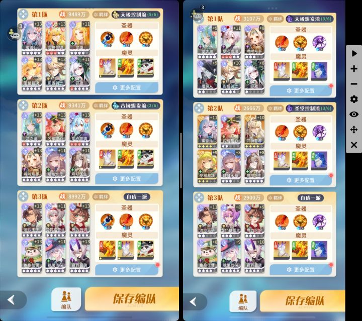 本人古圣流接近大成,刷塔越战1.4亿,图3,4是3种练度条件下的3队搭配,配队原则是1队最强双核心配银盾弥撒蜜雪和阵营羁绊辅坦(四大阵容的羁绊辅坦分别是哞哞,神女,厨娘,通灵),2队次强双核心搭配水母甜心咩咩和阵营辅坦,没有二队双核心可以女仆菖蒲或者流沙抱抱。前两队能赢就行,3队就随便配了一下满羁绊,这样保证每队接近满羁绊且只有一两个输出位置,其他全是坦克和辅助,避免了无效输出角色,极大增强了生存能力。
