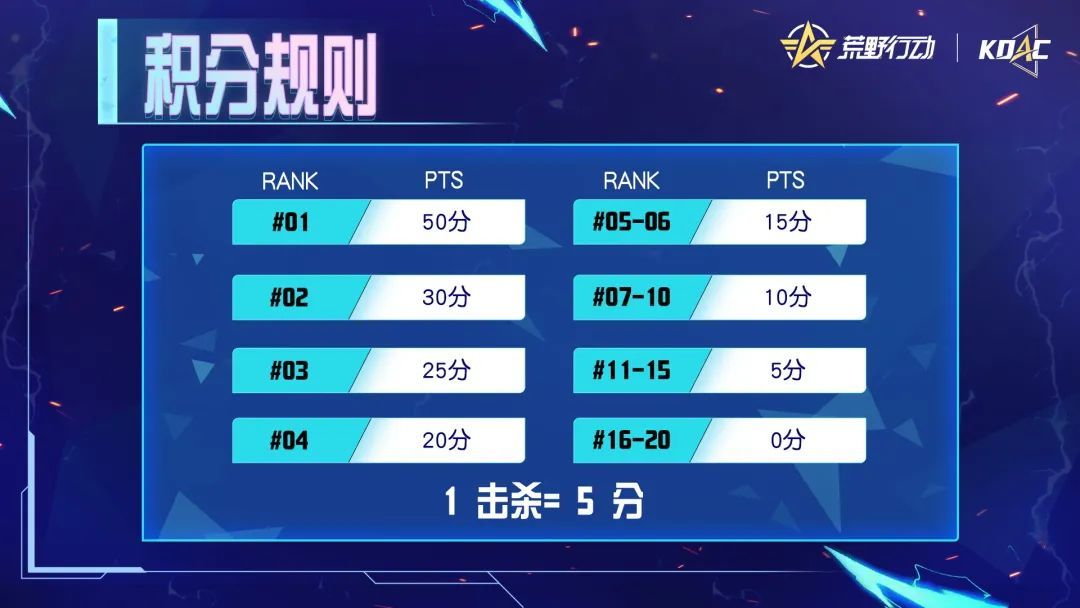 本次预选赛将根据对局名次和击杀数量,来决定出线队伍。名次越高,所获得的积分则越多(具体数值见下图);每击杀1名玩家,可额外获得5积分。