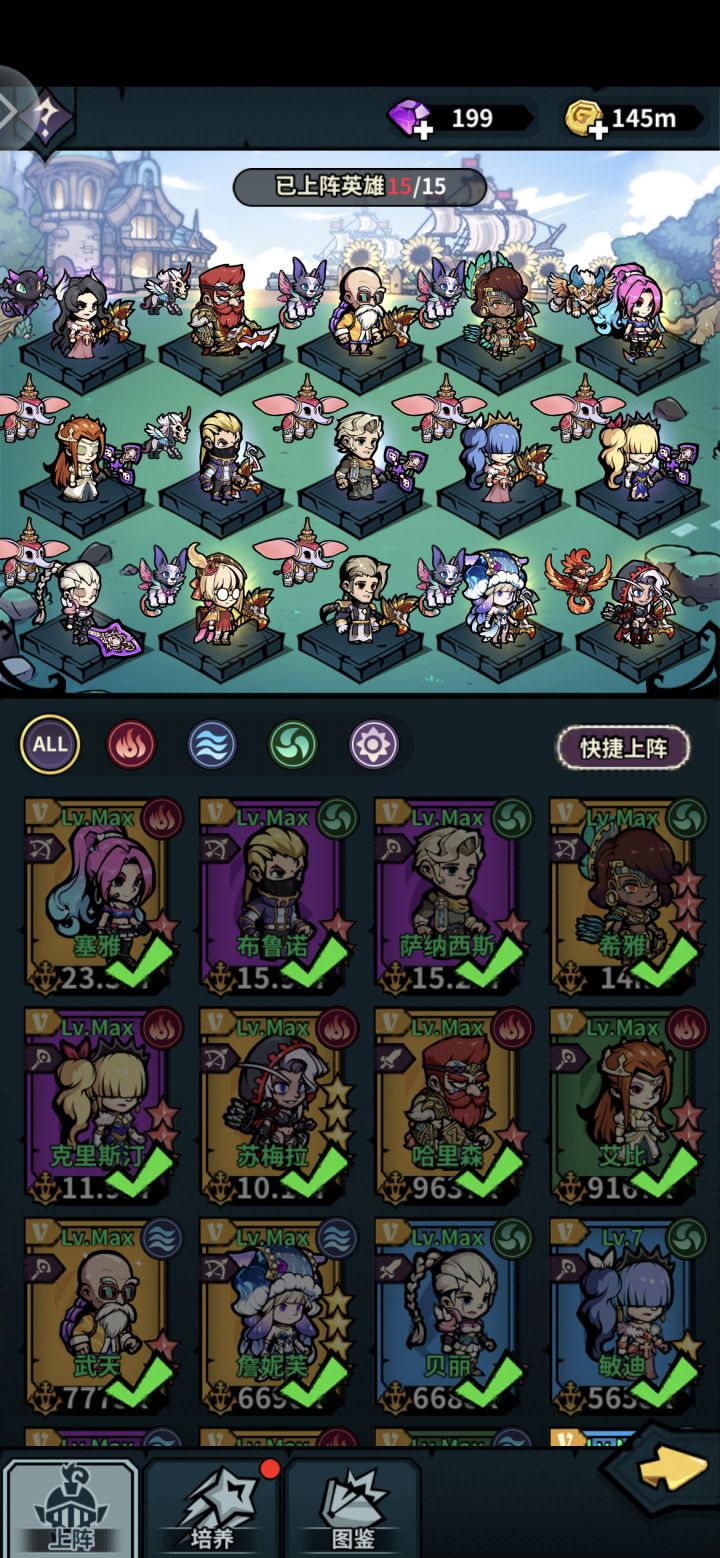 打精灵秘境和战斗号角是和关卡不太一样的,这两个是可以一次性上15个人物的,很多小伙伴看了我之前一个攻略其实知道养不养贝利都可以用闪避流过关,但是我还是养了贝利,原因就是贝利是近战扛伤害的时候会优先走在前面。这两个都是只有能扛得住就可以过关的原则上不缺输出缺只是扛不住的。