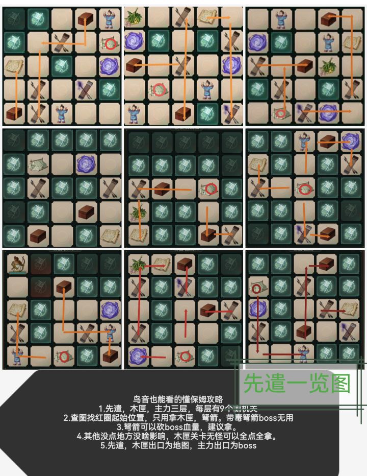 2.查图找红圈起始位置,只用拿木匣,弩箭。带毒弩箭boss无用