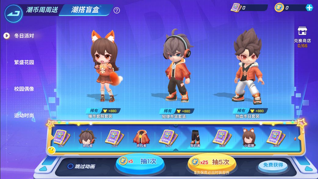 【小狐狸·暖冬套服套装】、【命石者·轻便冬装套装】、【小狮子·热血冬日套装】均可用潮搭游戏币免费抽取或兑换获得。