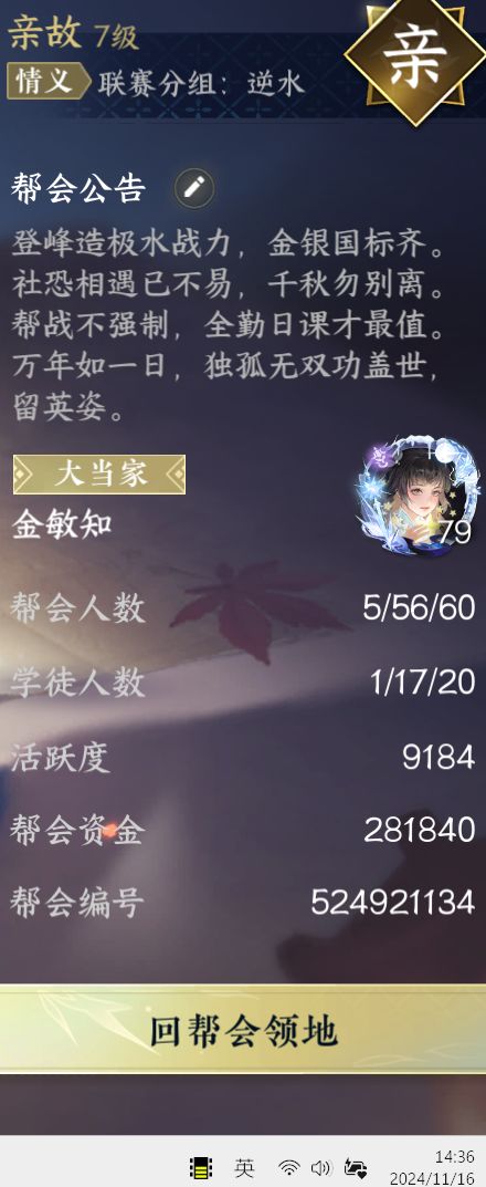 浮生若梦新帮会刚建一个月,恳求忠实玩家加入,限女号。帮名:亲故,会长:金敏知