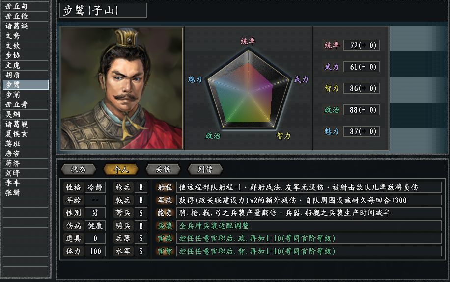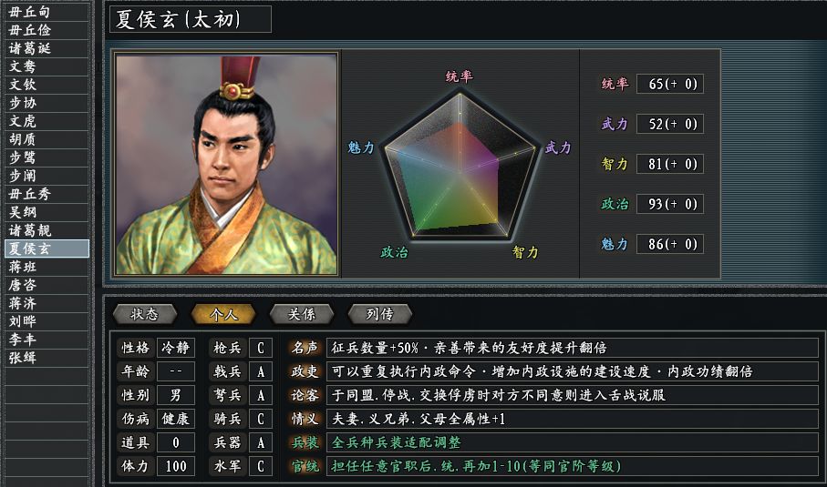核心谋士诸葛诞和夏侯玄二人,在惊鸿版的强化同样相当明显。诸葛诞把金刚升级成了龙铠,并凭借着商政和政吏显著拔擢了内政效率和兵粮产量。夏侯玄则是在名声的基础上,附加了政吏、论客和情义,不过他的冷静性格还是不大擅长吵架的。