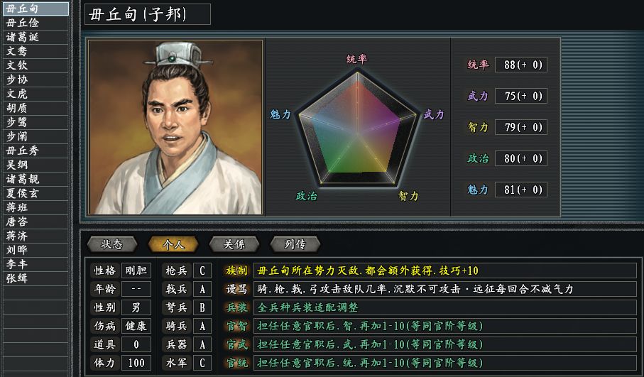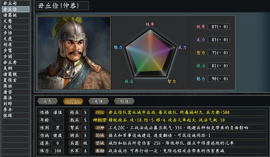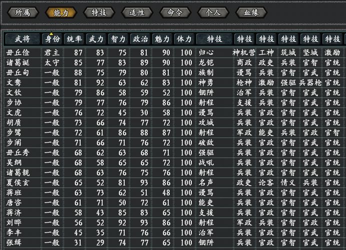 毌丘俭父子二人,其实是很有雄心的,遗憾成王败寇,原版三国志11游戏的策划根本没想过给他们安排特技。惊鸿版就大方得多了,毌丘俭同时得到了归心、神机营、工神、筑城、坚城和激励六个战法,带领投石车部队在战场上会越打越硬,每当击溃敌军还能大幅提升城墙耐久和守军兵力!儿子毌丘甸掌握的族制和谩骂,虽然火力值忽略不计,但是能够额外获得技巧并附加沉默。作为副将来说,还是很优秀的。