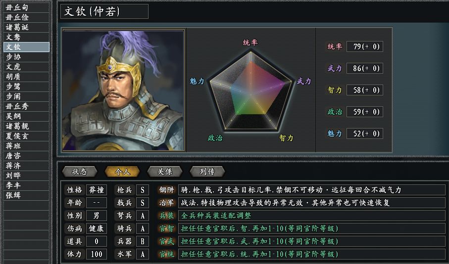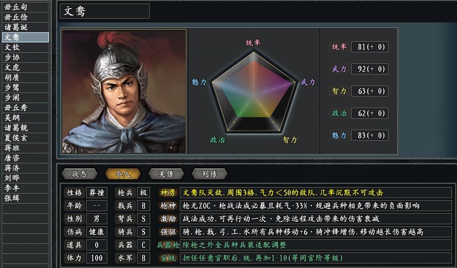 文钦和文鸯,妥妥的老子英雄儿好汉!原版三国志11游戏里的白板文钦,在惊鸿版里可以禁锢对手的移动,文鸯就更加不得了了,同时身怀神勇和枪神技能,携带枪兵出战的威力要远远高于骑兵。遥想原版的文鸯,被一个突袭打发了,除了骑兵之外,就没有拿得出手的兵种。相比之下,惊鸿文鸯是真的脱胎换骨,这才无愧于赵子龙七进七出的原型嘛!