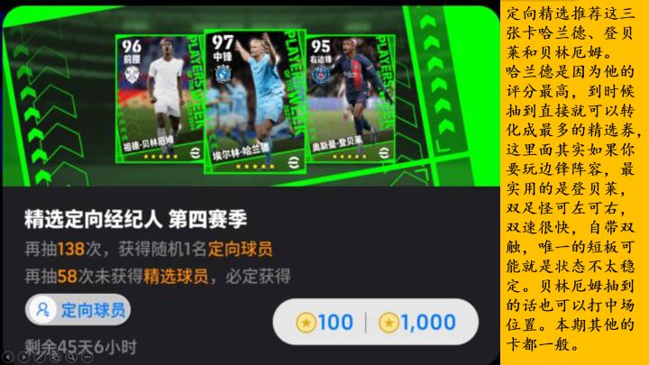 定向精选推荐这三张卡哈兰德、登贝莱和贝林厄姆。哈兰德是因为他的评分最高,到时候抽到直接就可以转化成最多的精选券,这里面其实如果你要玩边锋阵容,最实用的是登贝莱,双足怪可左可右,双速很快,自带双触,唯一的短板可能就是状态不太稳定。贝林厄姆抽到的话也可以打中场位置。本期其他的卡都一般。