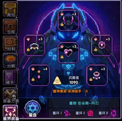 星界装备:星界远征副本产出的魔女外装,类似正常装备,共分为魔角、腰带、徽章、核心、耳环、手镯六个部位。魔女外装的构成有属性:第一个固定为抗魔值,另一个根据部位随机一条属性(耳环和手镯推荐用元穿的,其他的护穿/爆伤根据需求佩戴),魔女外装的属性只随等级的提升而增强,最高五级。副属性:一件魔女外装最多有两条副属性,可以进行副属性重铸更换词条,但是无法增加词条数,所以最好选择有自己需要的第二条属性且副属性有两个词条的魔女外装。抗魔效果:在星界远征副本中生效,和第二个属性词条相关。套装效果:某一种魔女外装凑齐六件套时激活,可以增强同属性的魔女技能。