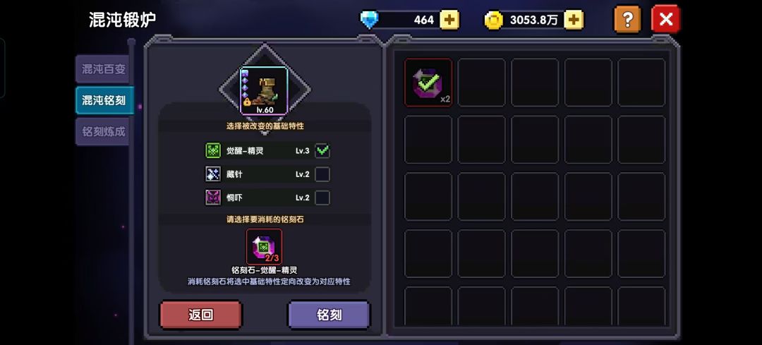 混沌铭刻:基础特性可以用对应的铭刻石铭刻,n个铭刻石可以铭刻一个n级的基础特性。不同的基础特性有不同的铭刻进度需求,选择某种想铭刻的基础特性后,将带有该基础特性词条的混沌暗金拿去铭刻练成,每一级基础特性提供一点铭刻进度,太古装备翻倍。ps:如果已经存在一个2级的基础特性,你想把它变成3级,则需要该混沌装备自带一个3级的基础特性,然后你用3个对应的铭刻石将该特性铭刻,这样你原本的2级基础特性变成了3级,3级的变成了2级。需要注意的是,铭刻只能替换词条及其等级,不能提升总等级,所以如果你的一件太古装备是2+2+2,那么是无法铭刻3级觉醒特性的,然而每一级的觉醒特性都提升颇大。