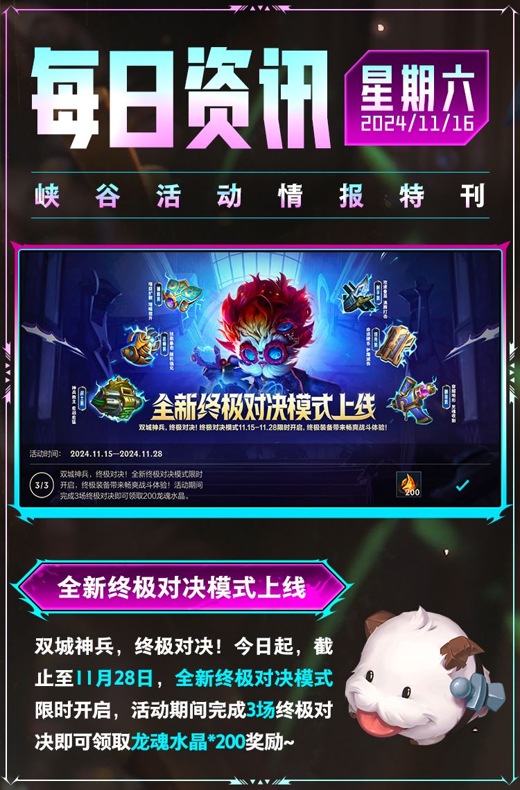 圣枪游侠 卢锡安更新后多项技能调整,召唤师们都体验了吗?截止至11月20日,召唤师完成任务即可获得龙魂水晶*500奖励~