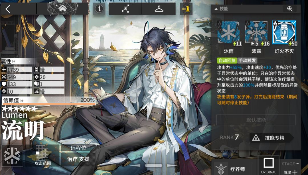 作为三周年的赠送的六星奶妈,流明的强度可以说奶羊没出来之前一直是最强奶妈,奶羊出来了之后地位有所下降,但是目前来说我还是推荐新手可以打五关拿下流明,因为他虽然是活动六星奶给的数值却非常高,不仅能奶还能解控,缺点是三技能第一波技能开启暖机时间较长,不过开启之后全程挂机还是非常舒服,前期打第六章主线有奇效,强烈建议萌新拿下。(目前可以通过愚人号活动获取,难度较高,建议只打五关拿个本体,后续再补文件夹)