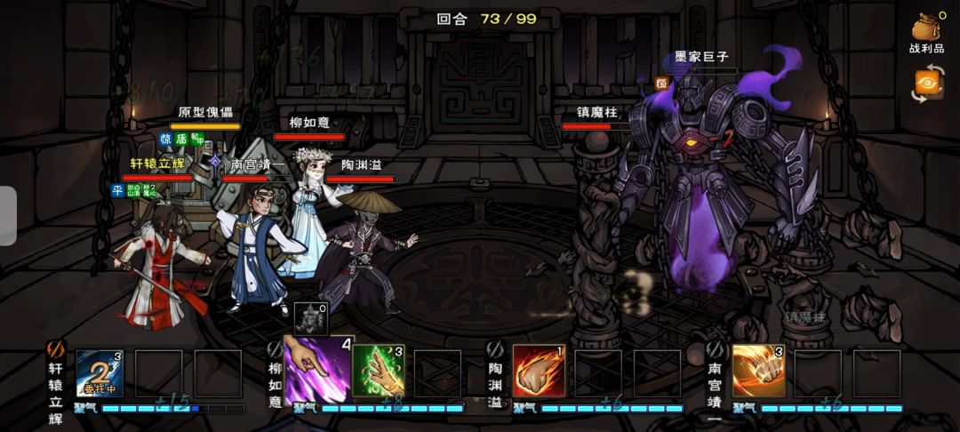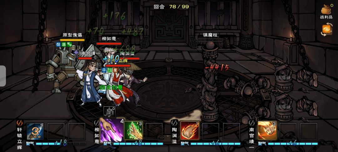 打法思路:主核心浑天气功15反伤,反伤装备有的就加,最好是有两个带浑天气功,然后这两个随从加防御的装备秘籍全脱,只加气血回复的 ,武学套路轻功都要基础,主角随便带出伤快的,然后一个奶妈(带狂风或碎虚)清柱子,要手动关闭 得留一个。