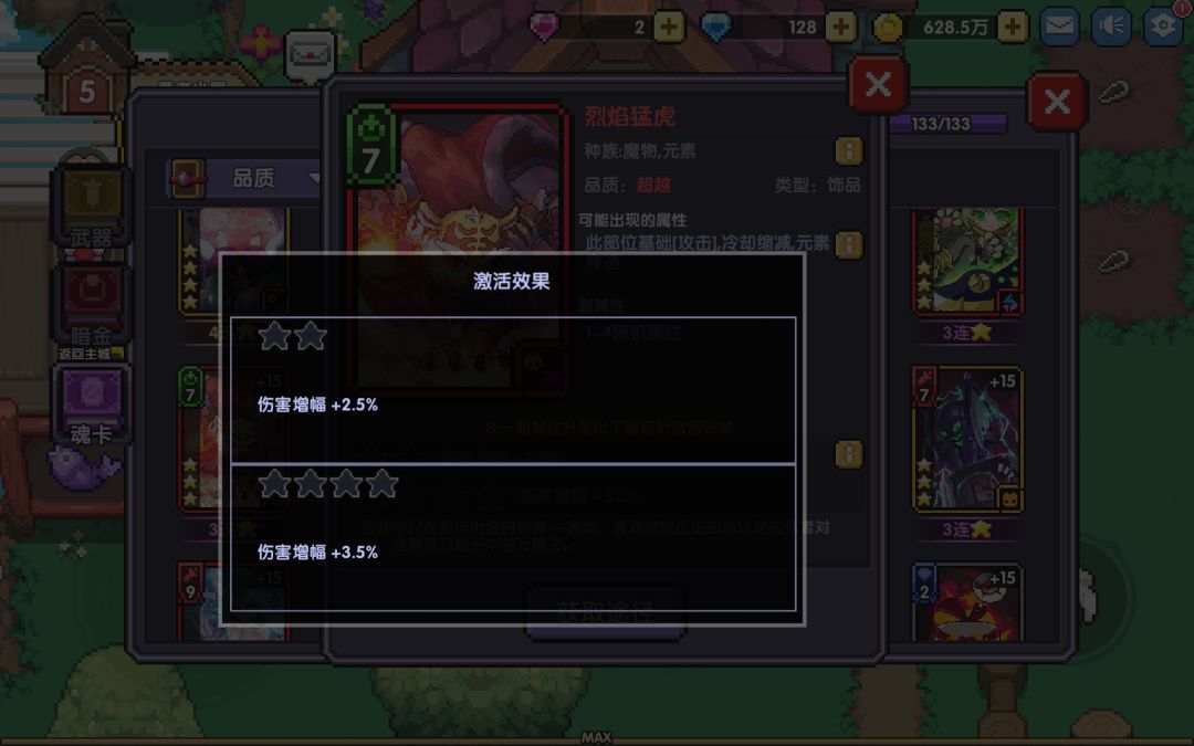 可单带,四连星后可提供6%的伤害增幅。需要注意的是伤增属性是一个独立的伤害计算乘区(假设我在宝石上获取了3.3%的伤增属性,同时装备了四星烈焰猛虎,那么我打出的伤害应为(100%+2.5%(二连星效果))*(100%*3.5%(四连星效果))*(100%+3.3%)也就是说,伤增获取越多,我最终伤害的乘次也就会更多,这也使得伤增属性难以稀释(稀释:由于同类增伤属性获取溢出,导致增加的伤害没有溢出前的高)),且目前只能通过烈焰猛虎和宝石获取,同时这张魂卡七cost的价格也让其他位置的魂卡有了更好的发挥空间,元素/魔物的羁绊也使得羁绊更易成型,且全场景可用。故萌新推荐指数四颗星