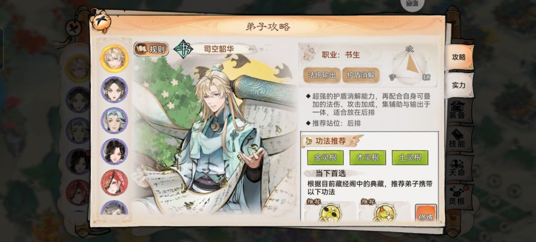 #最强祖师攻略 祖师的小伙伴们好,卿卿今天带来一篇萌新弟子养成攻略。有这样一个弟子,如果对面厚厚的盾就等着遭殃吧,他不管是定位输出还是辅助都能够驾驭的了,他是一届书生,自然腹有诗书气自华。这个弟子就是破盾能手司空韶华。
